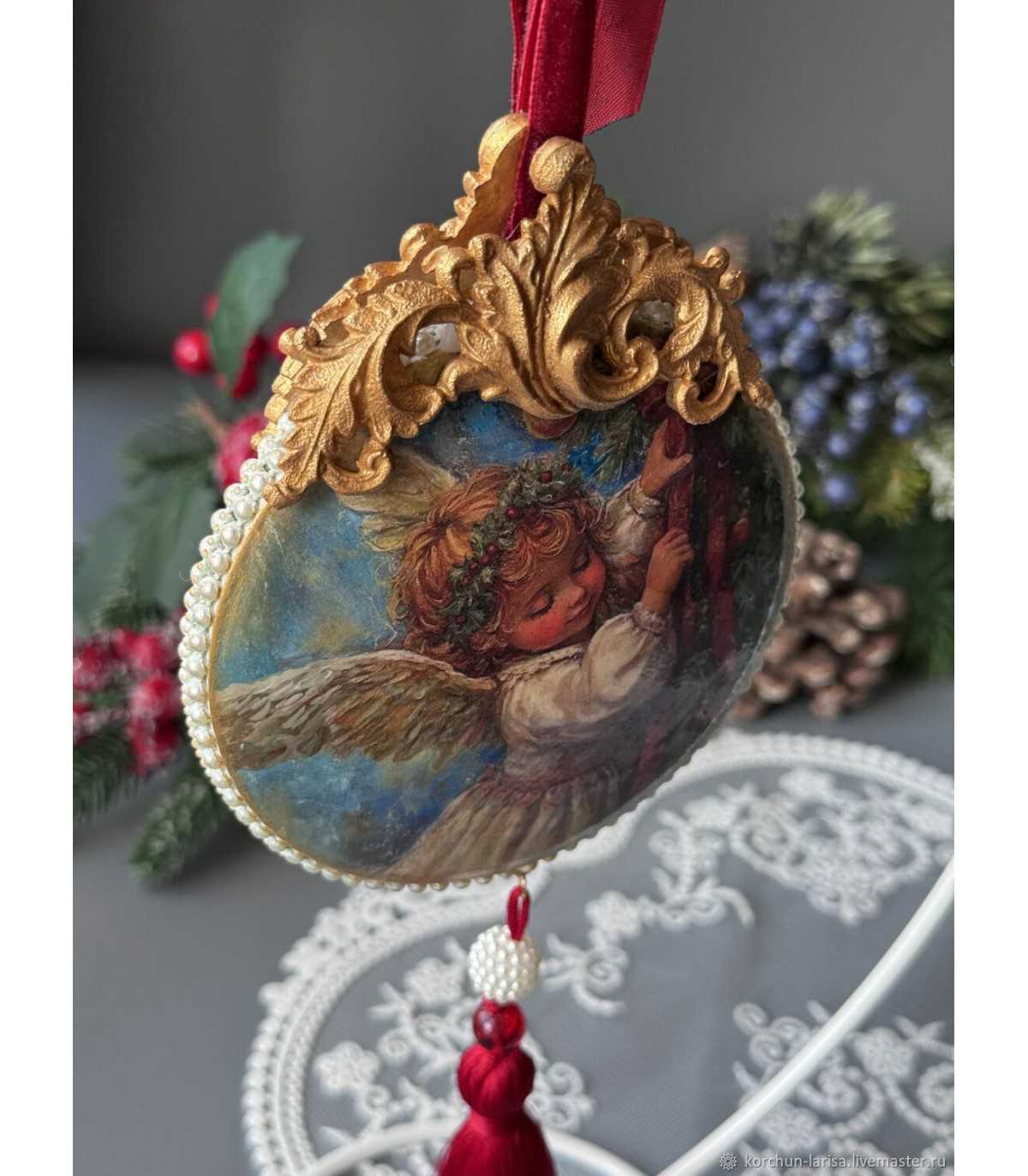 Деревянный медальон Ангел. Декупаж, лепнина, позолота, патина, кисть.
