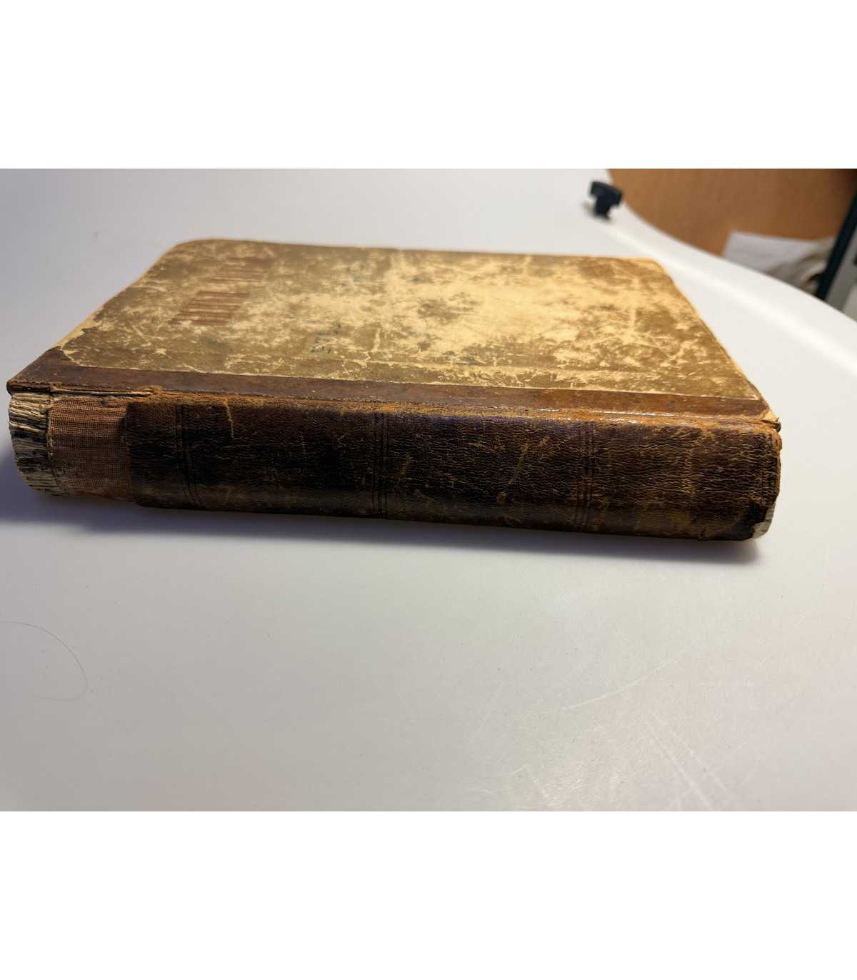 Переплет: смешанный картонно-кожаный; тиснение на корешке, корешок частично утрачен (нет кусочка кожи сверху), разрывы; на крышках незначительное расслоение картона по уголкам и краям, потертости.