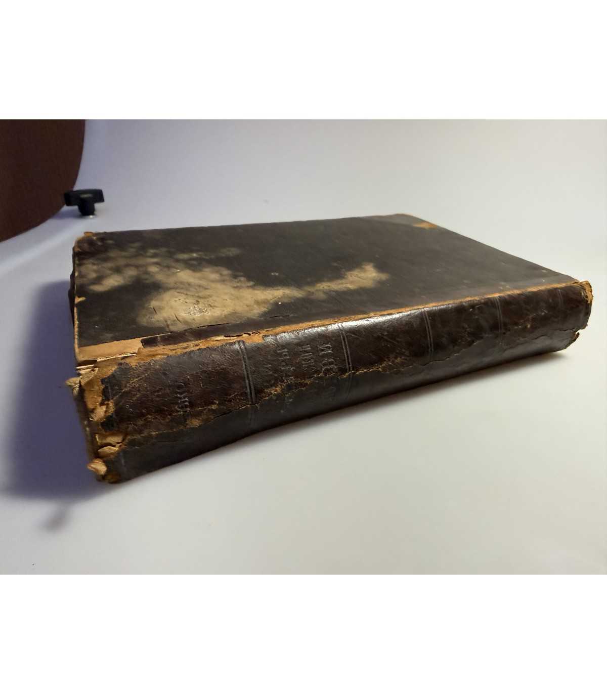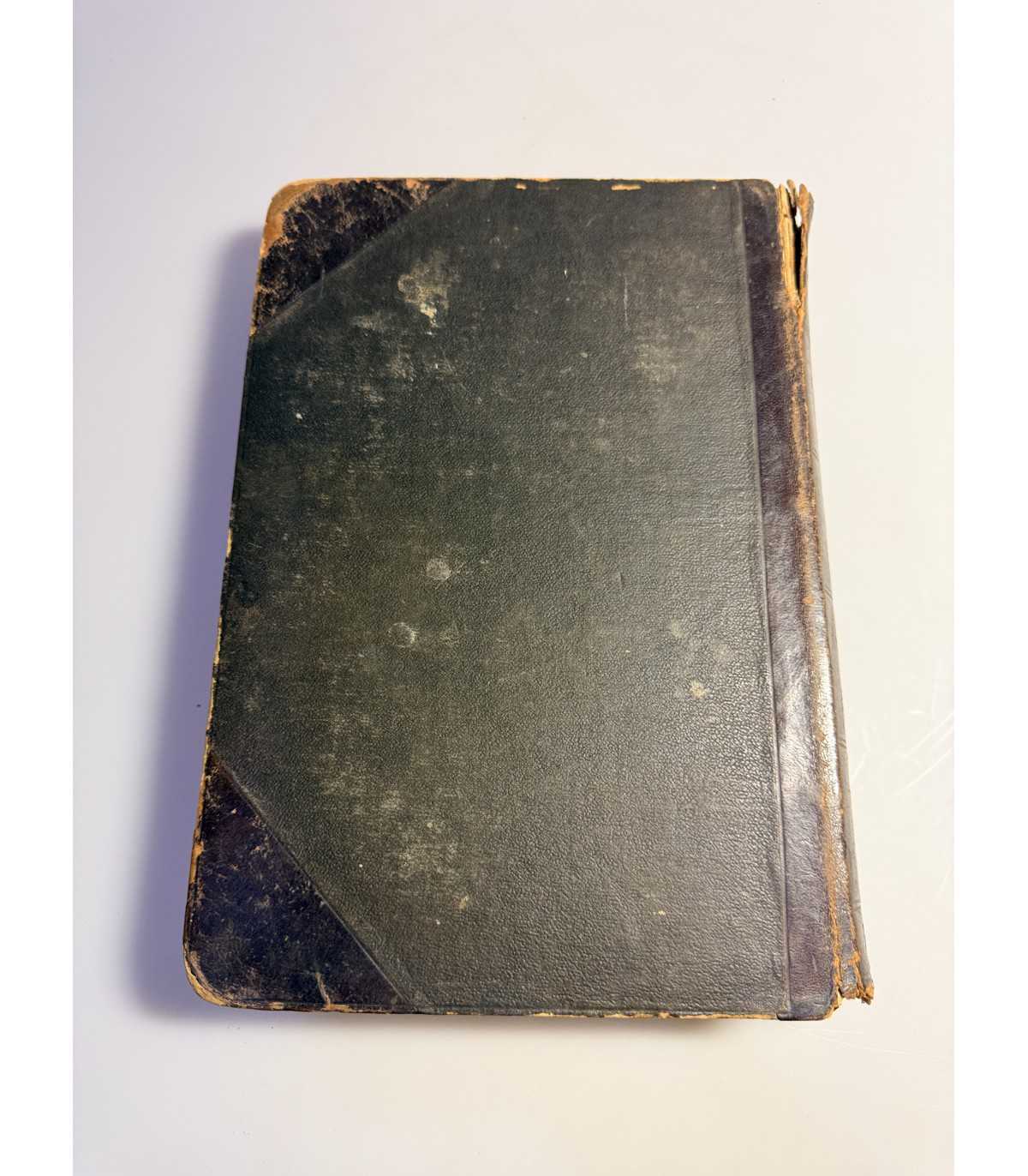Переплет: смешанный коленкоровый, кожаный, потертости и мелкие разрывы, утраты кусочков кожи на корешке, на крышках пятна. По краям и уголкам крышек потертости и расслоение картона. Верхняя крышка переплета не скреплена с КБ, но свободный лист форзаца и титул скреплены с ней. Состояние: хорошее
