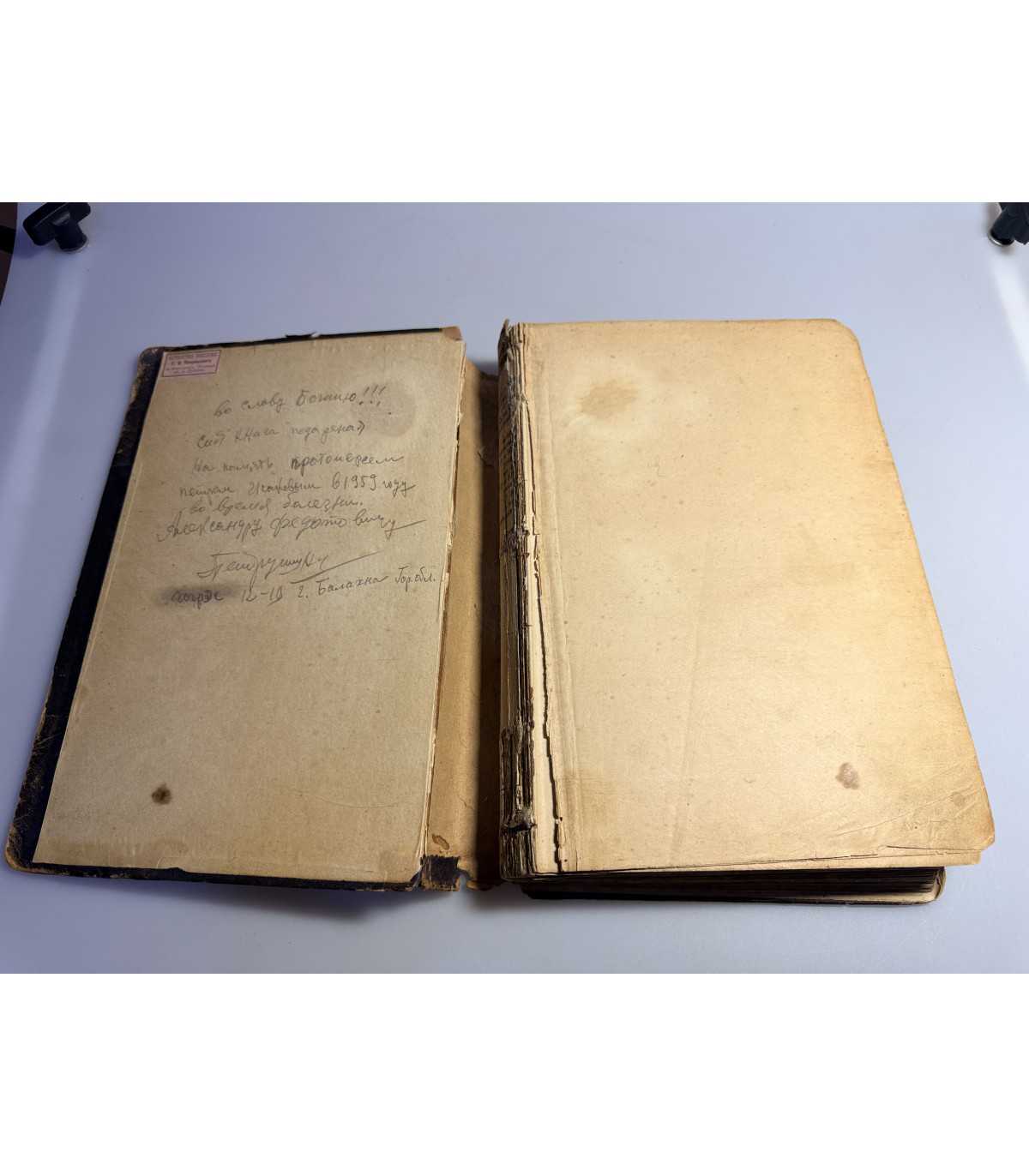 Книжный блок: - плотный, не деформирован, не распадается, трещинки, выпадающих листов - нет, «лисьи» пятна, загрязнения или пятна от влаги на страницах присутствуют. Титульный лист - сохранен. Есть пометки и надписи - дарственные и пр.