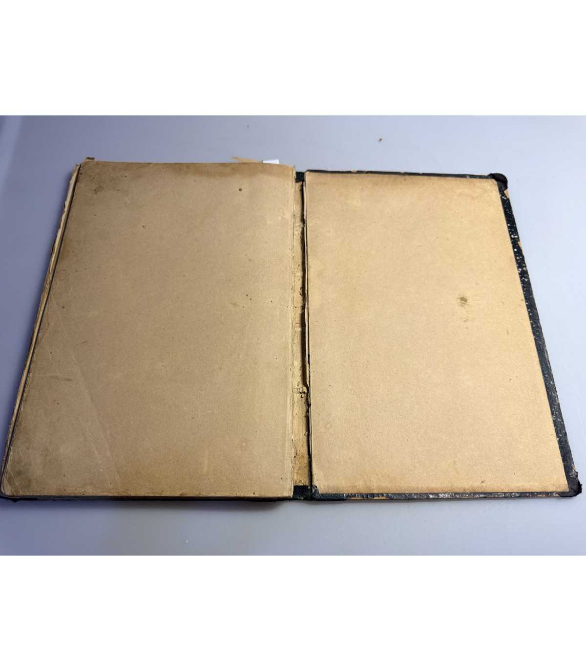 Книжный блок: - не плотный, немного деформирован, распадается, выпадающие листы - есть, «лисьи» пятна, загрязнения или пятна от влаги на страницах присутствуют. Титульный лист - сохранен. Есть пометки. В середине текста утрата одного листа. Некоторые листы потрепаны по краям.