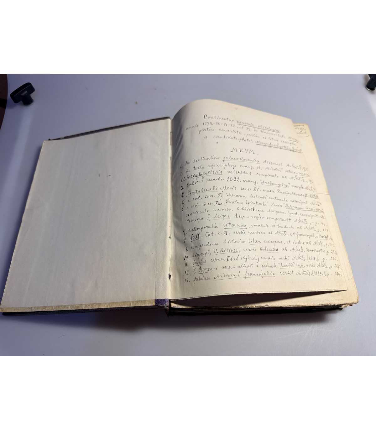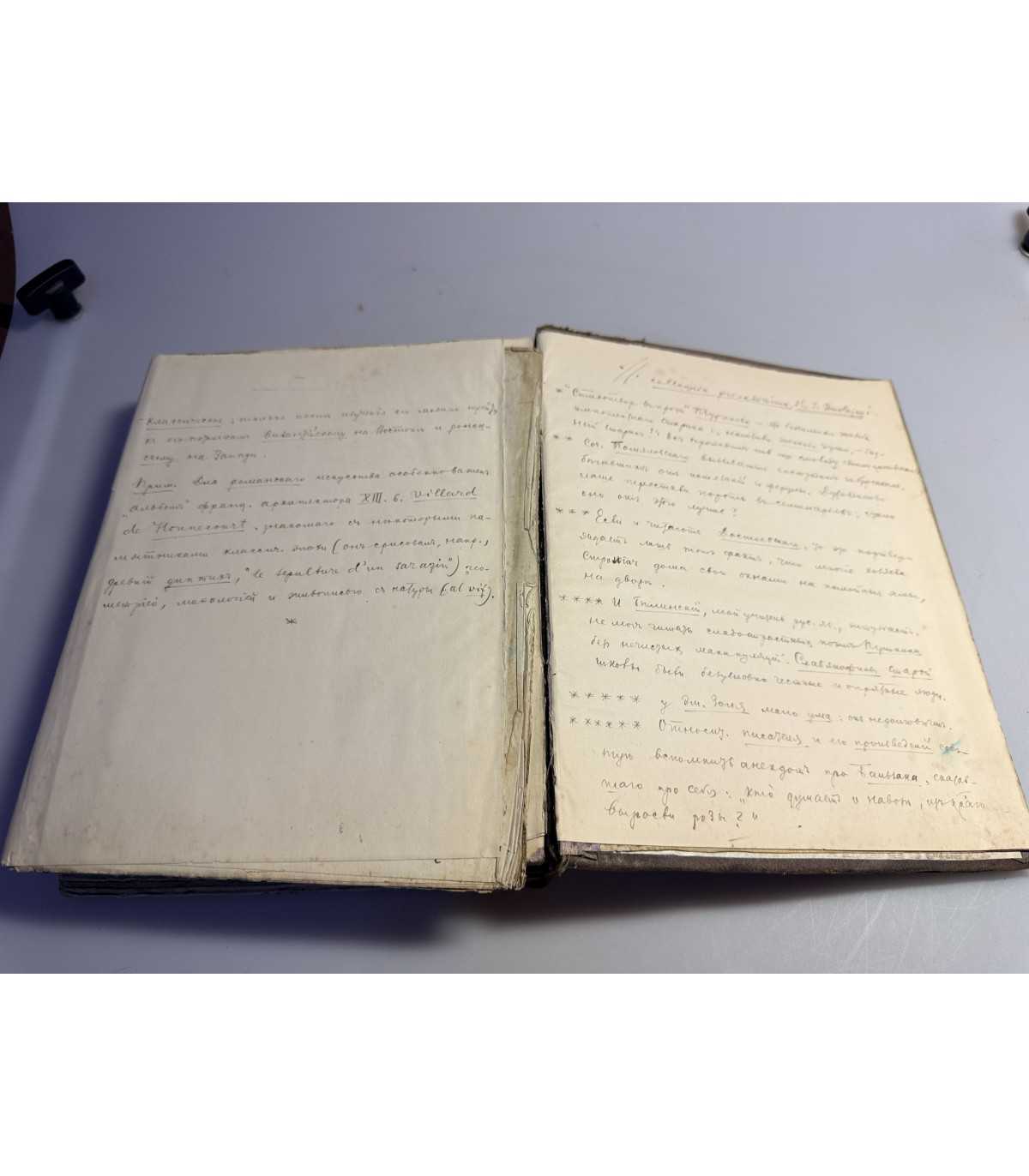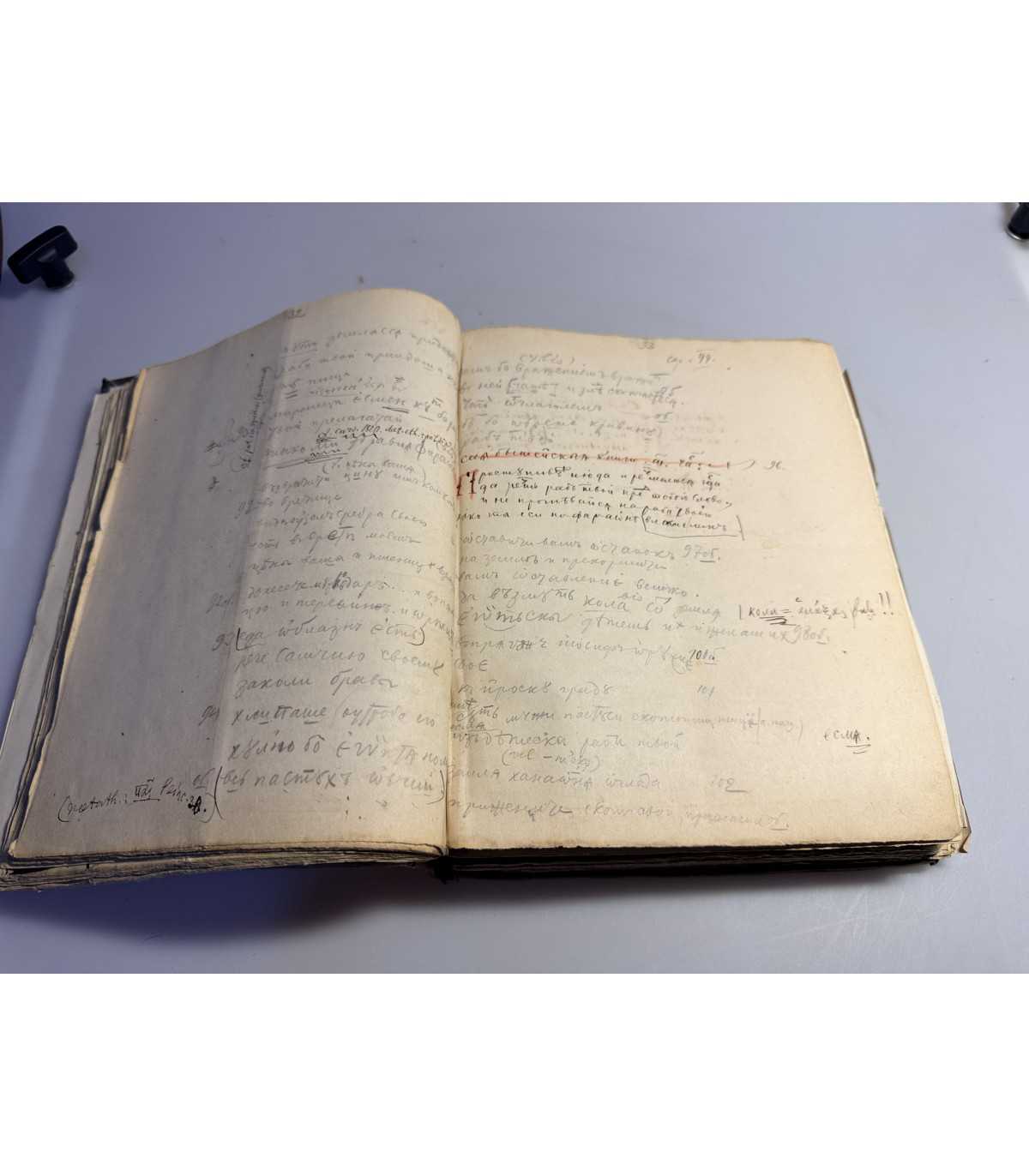 Книжный блок: - плотный, не деформирован, не распадается, выпадающих листов - нет, представляет из себя подшивку различных листов и рабочих тетрадей. Муаровые великолепные форзацы с подписью владельца на переднем.