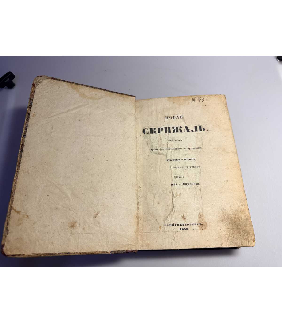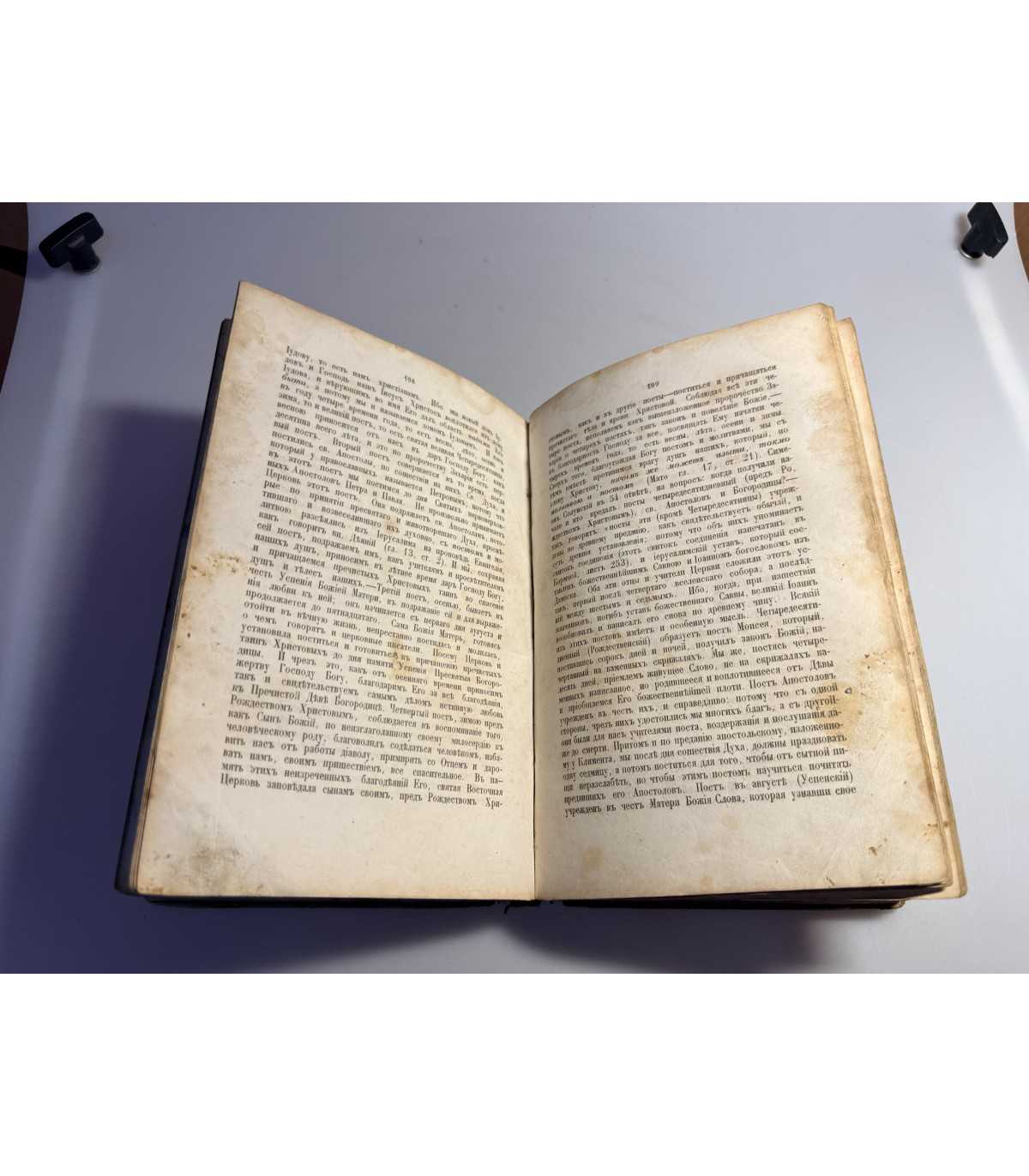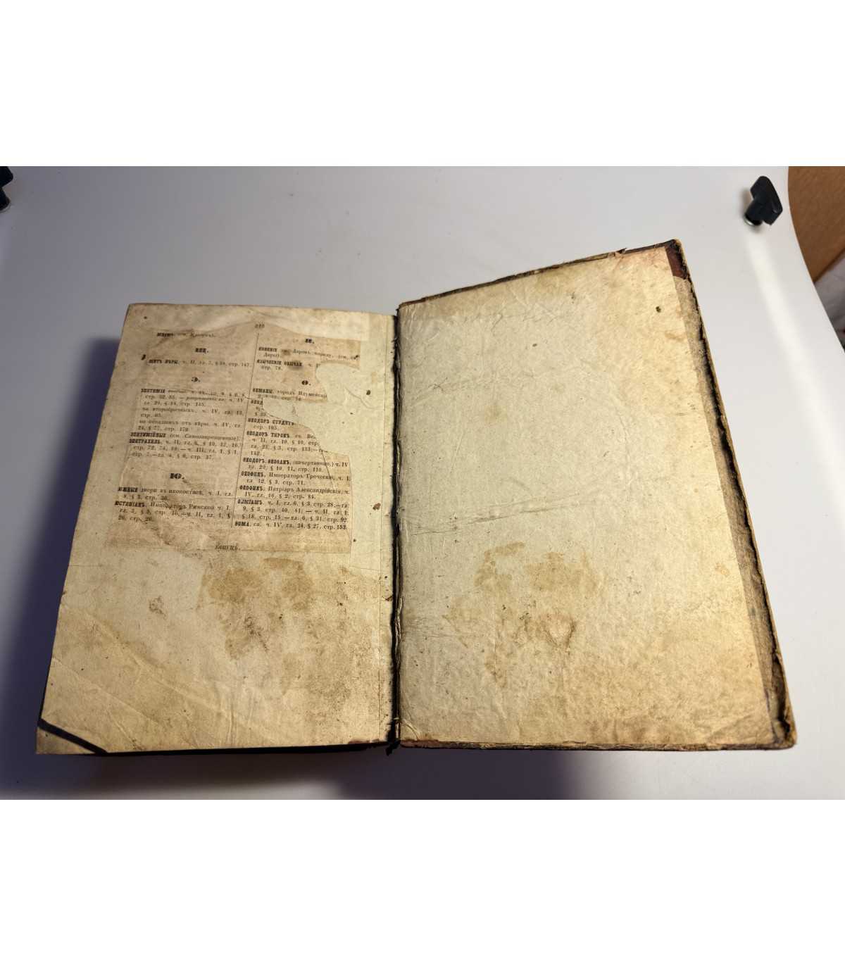 Книжный блок: - плотный, не деформирован, не распадается, выпадающих листов - нет, «лисьи» пятна, загрязнения или пятна от влаги на страницах присутствуют. Титульный лист - сохранен. Есть пометки и библиотечные штампы. На переднем форзаце владельческая надпись протоирея Н.