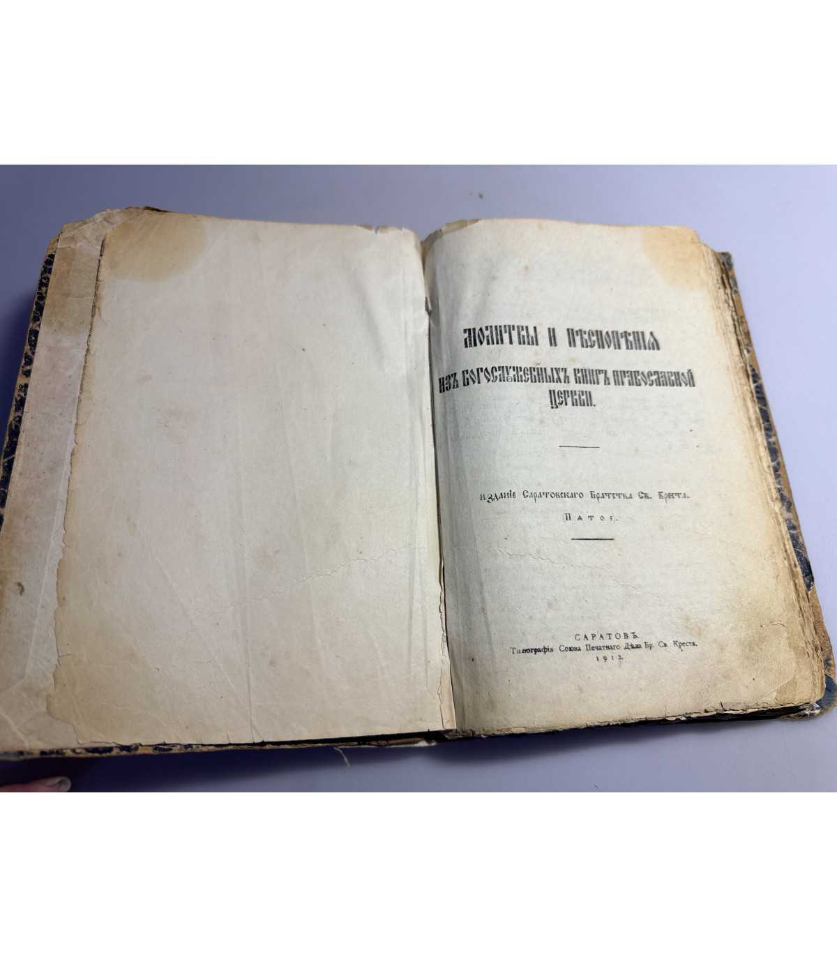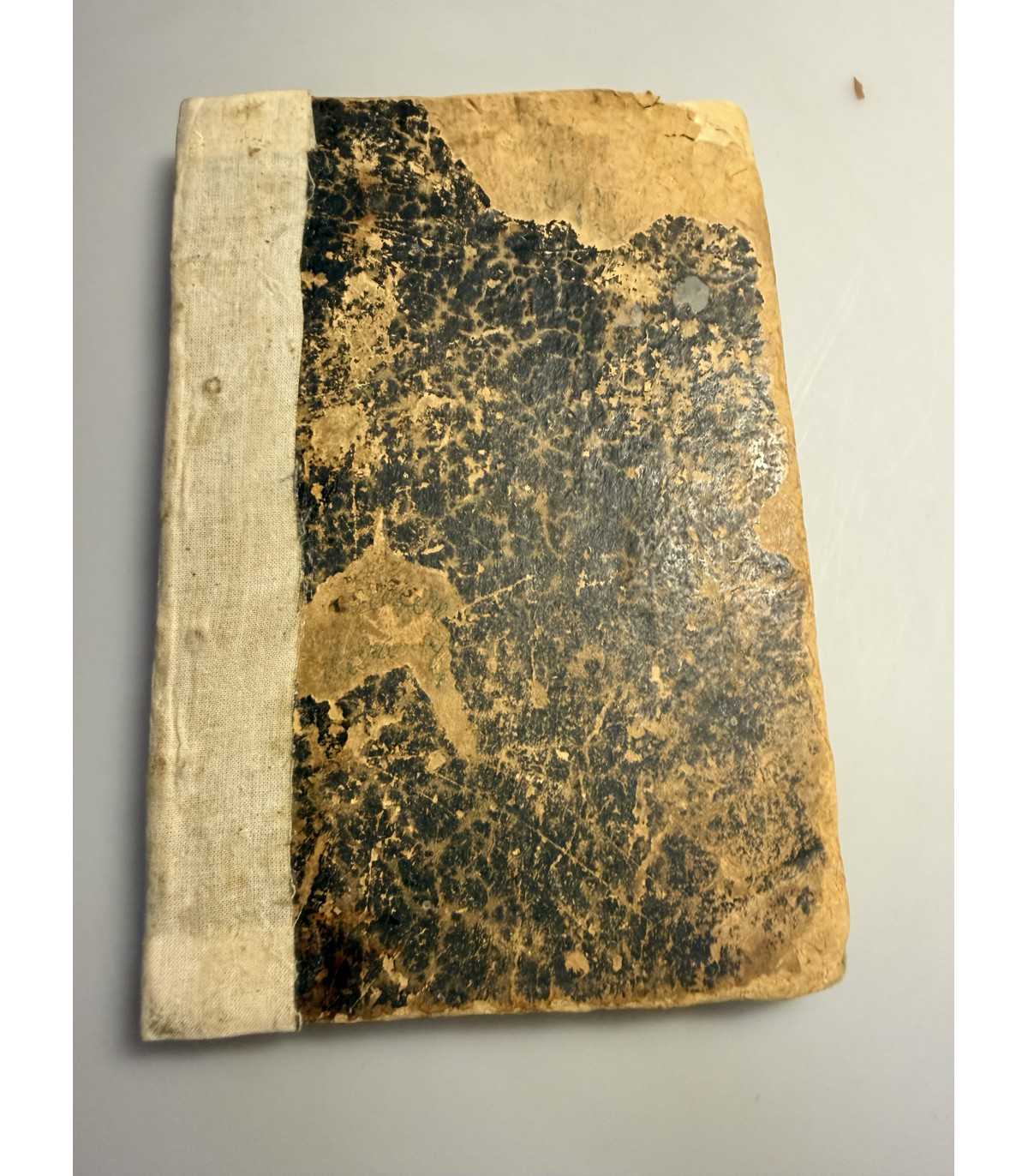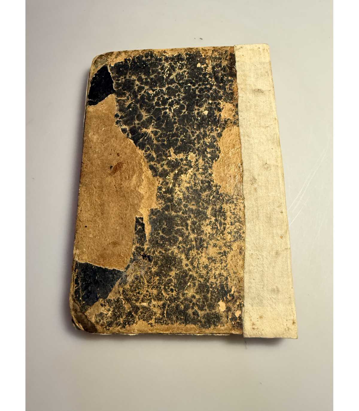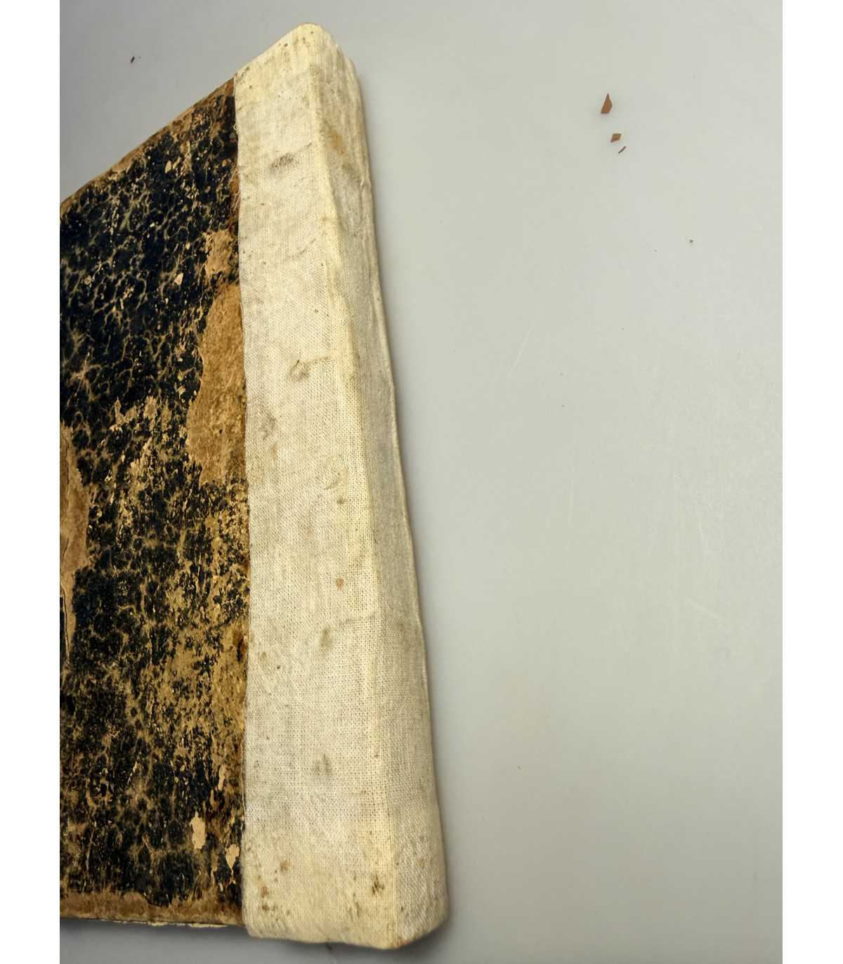 Книжный блок: - не плотный, деформирован, не распадается, есть трещинки у форзацев. Выпадающих листов - нет, «лисьи» пятна, есть утраченные и надорванные листы. Титульный лист - сохранен, форзацы исписаны, пометки, края листов потрепаны.
