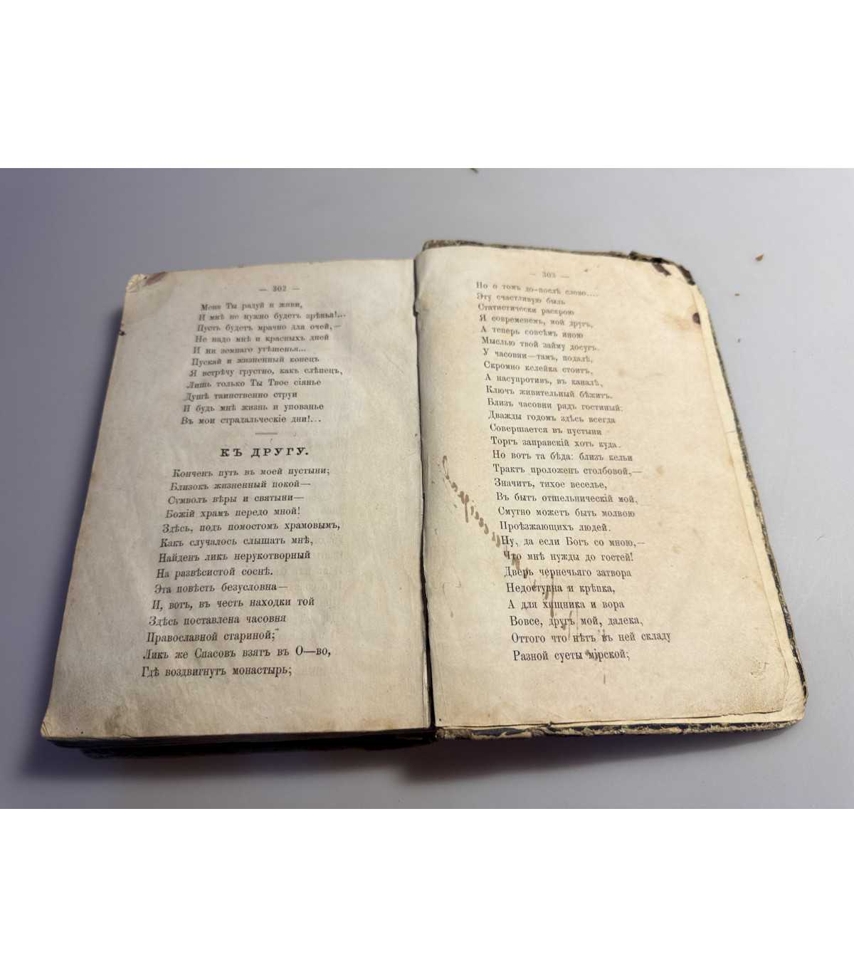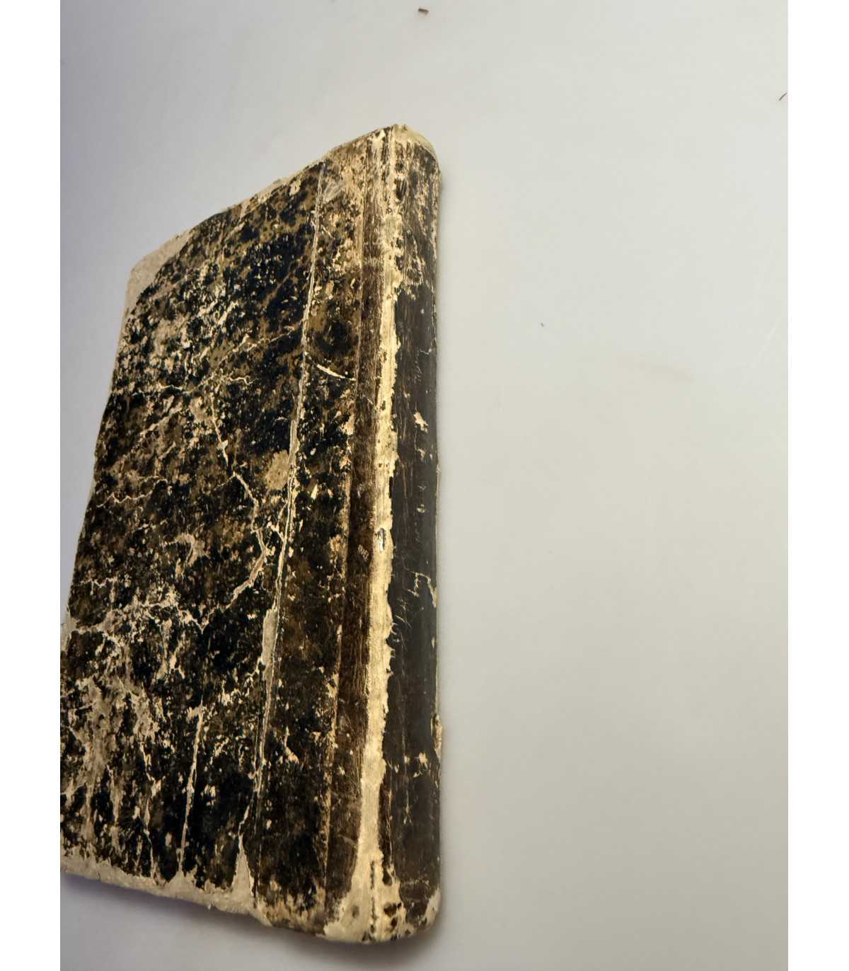 Переплет: смешанный картонно-кожаный, с тиснением золотом на корешке, потертости и мелкие разрывы. Утраты кусочков кожи на корешке. По краям и уголкам крышек потертости и расслоение картона, утраты цветной бумаги.