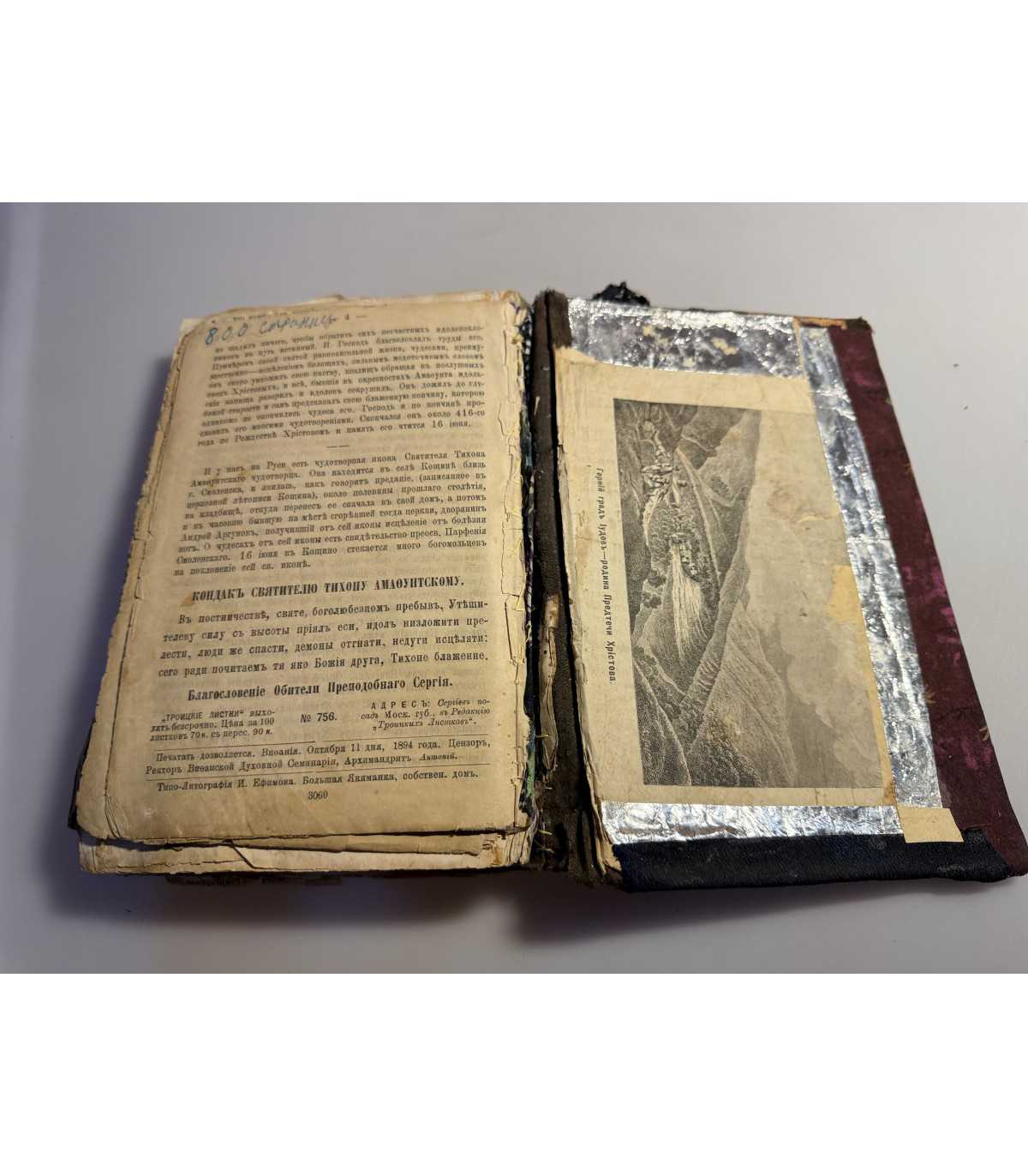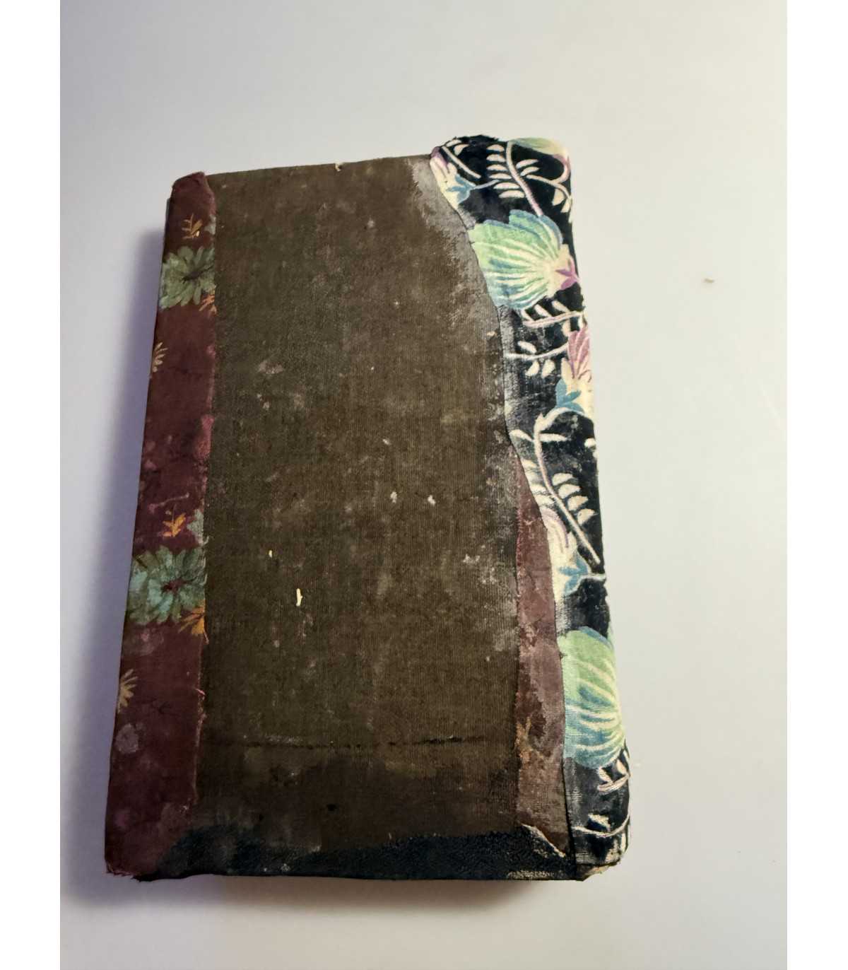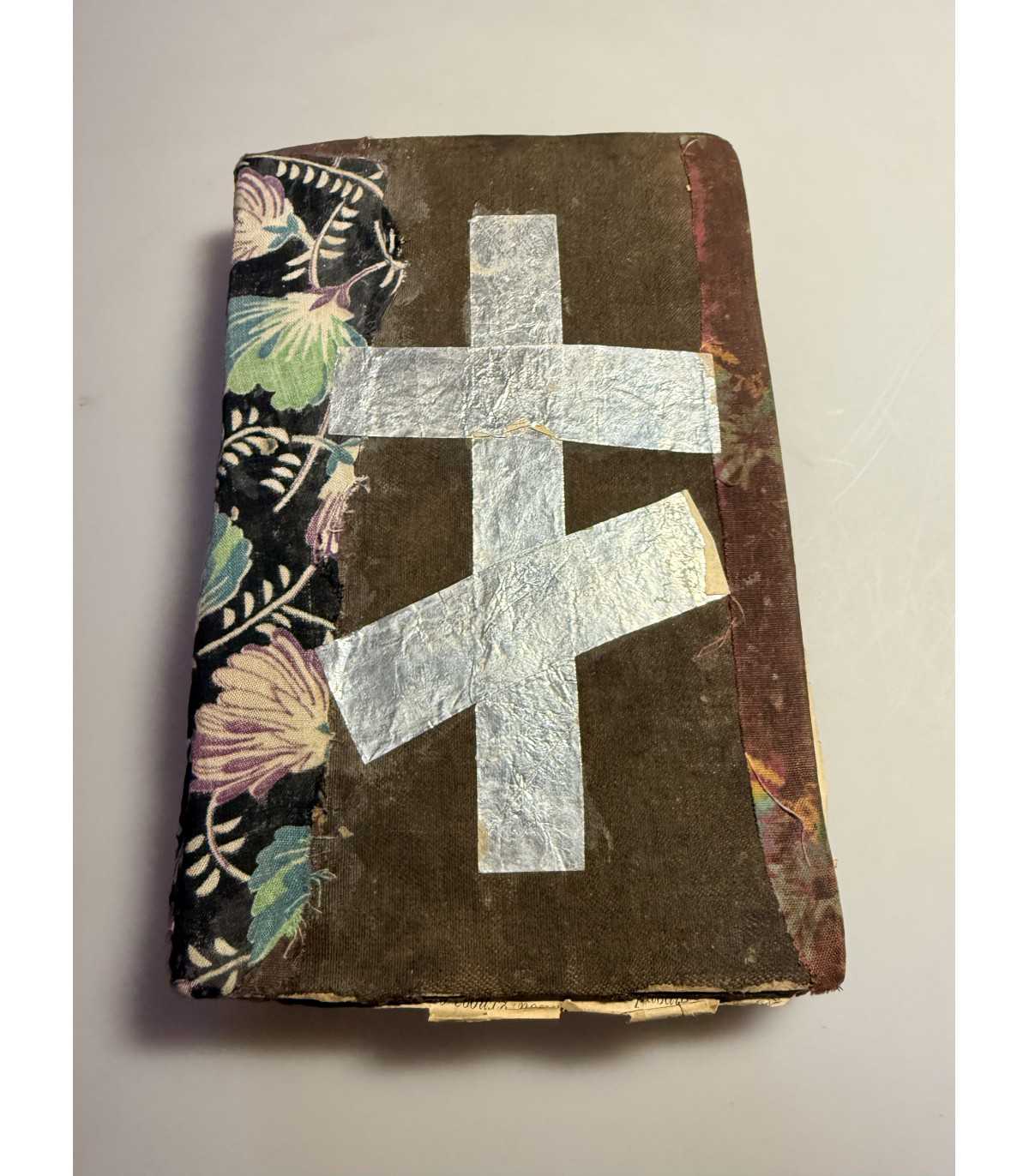 Переплет: картон, ткань, самодельные подклейки, на верхней крышке крест из фольги.