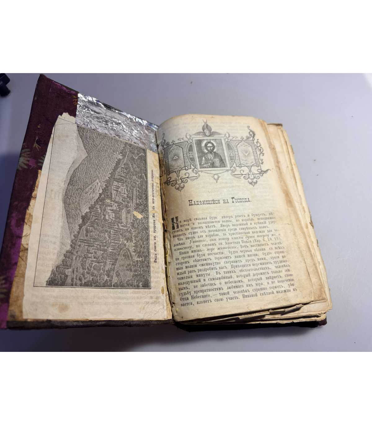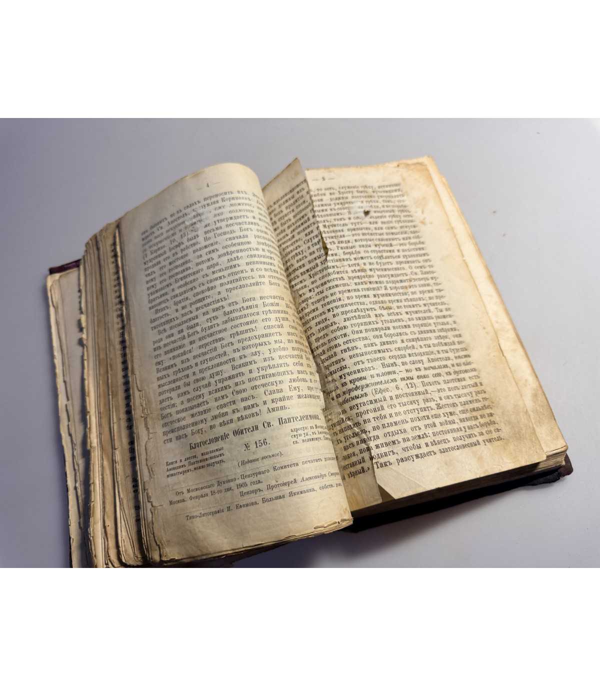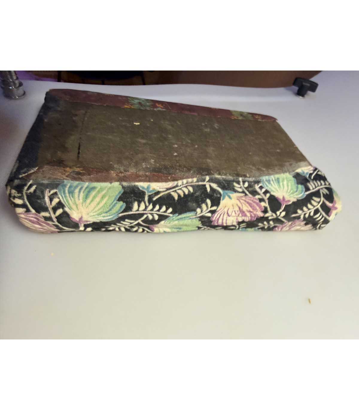Переплет: картон, ткань, самодельные подклейки, на верхней крышке крест из фольги.