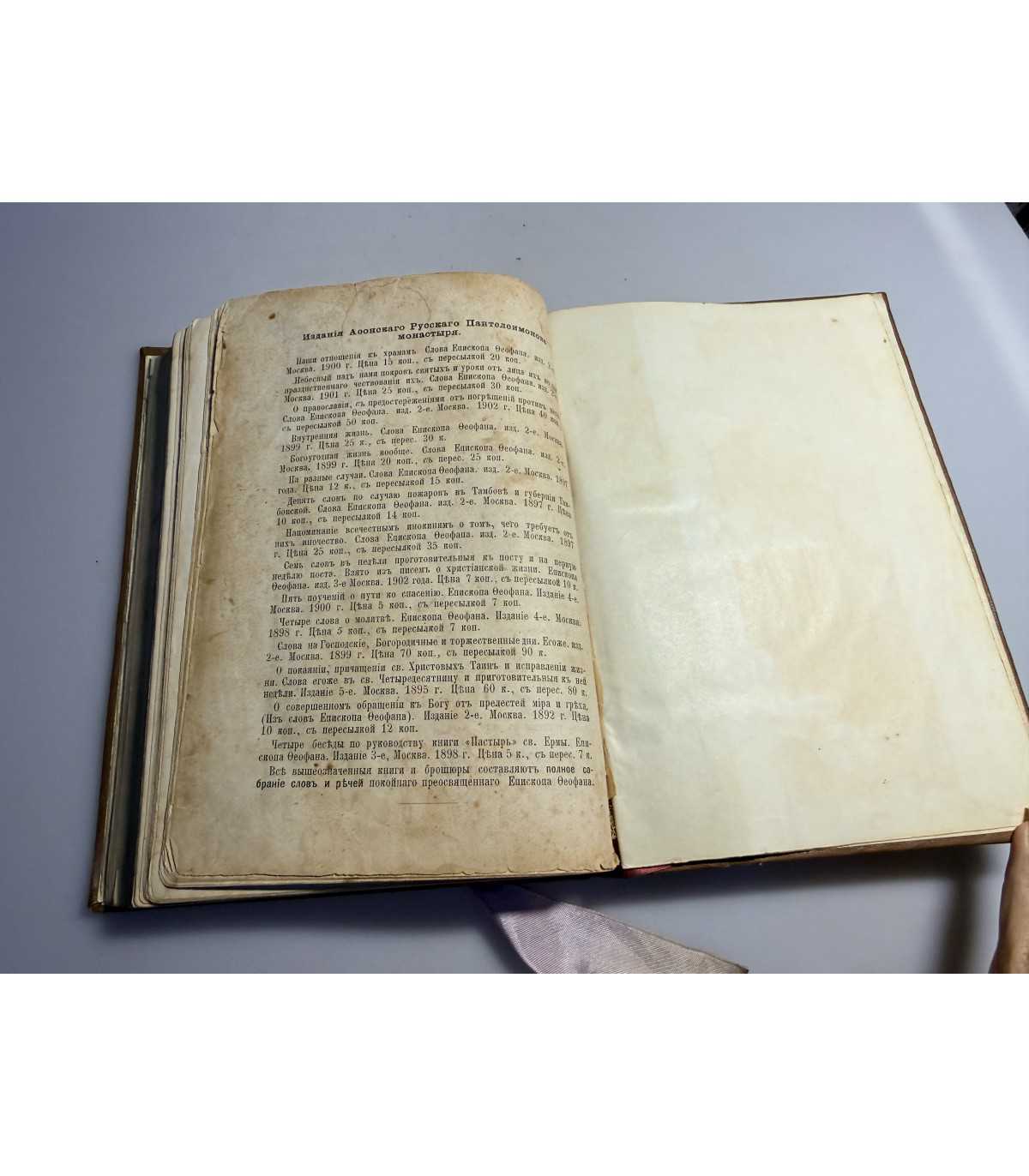 Книжный блок: - плотный, не деформирован, не распадается, выпадающих листов - нет, «лисьи» пятна, загрязнения или пятна от влаги на страницах присутствуют. Титульный лист - сохранен. Есть пометки и надписи (не много). В конце перечень изданий Афонского Русского Пантелеймонова монастыря.
