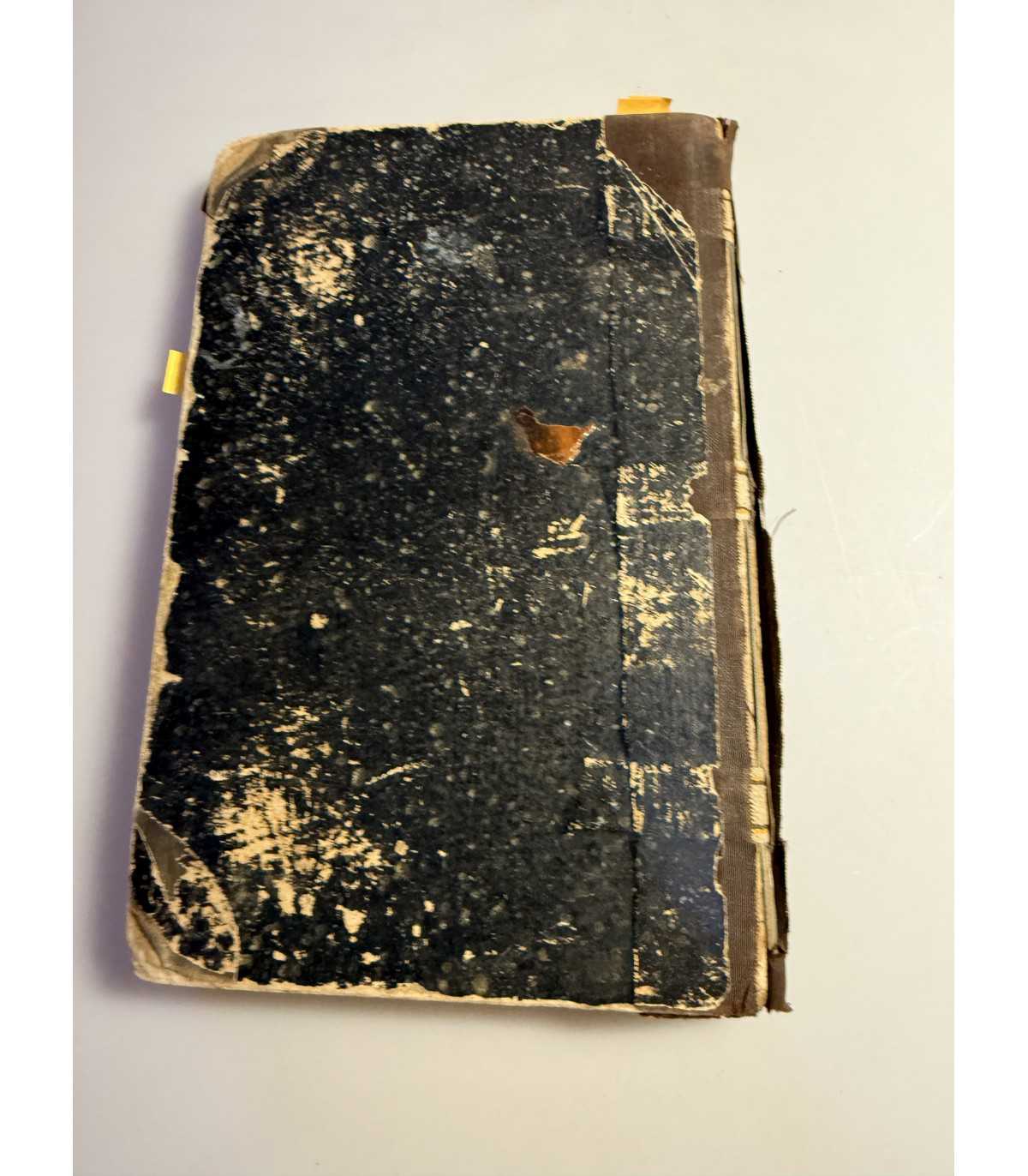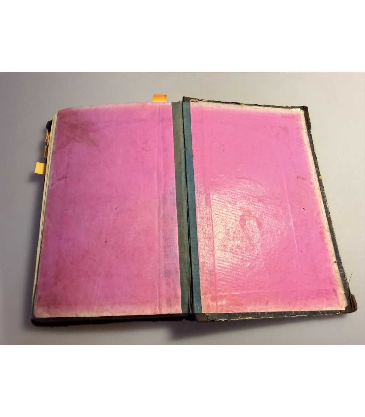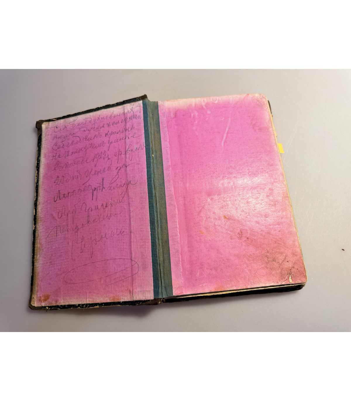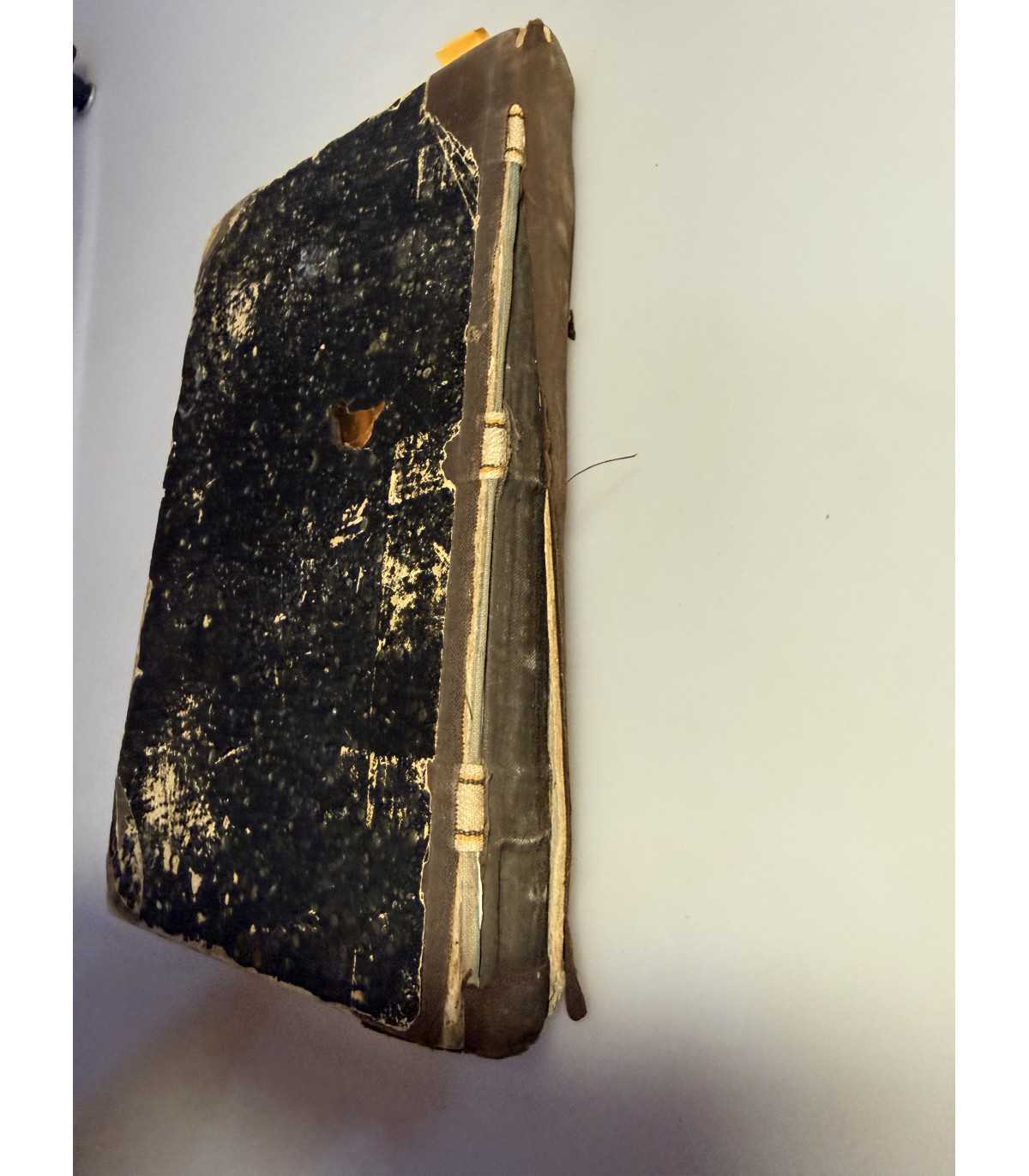 Переплет: смешанный картонно-кожаный, потертости и разрывы, утраты кусочков кожи на корешке, и бумаги на крышках. По краям и уголкам крышек потертости и расслоение картона. Состояние: хорошее