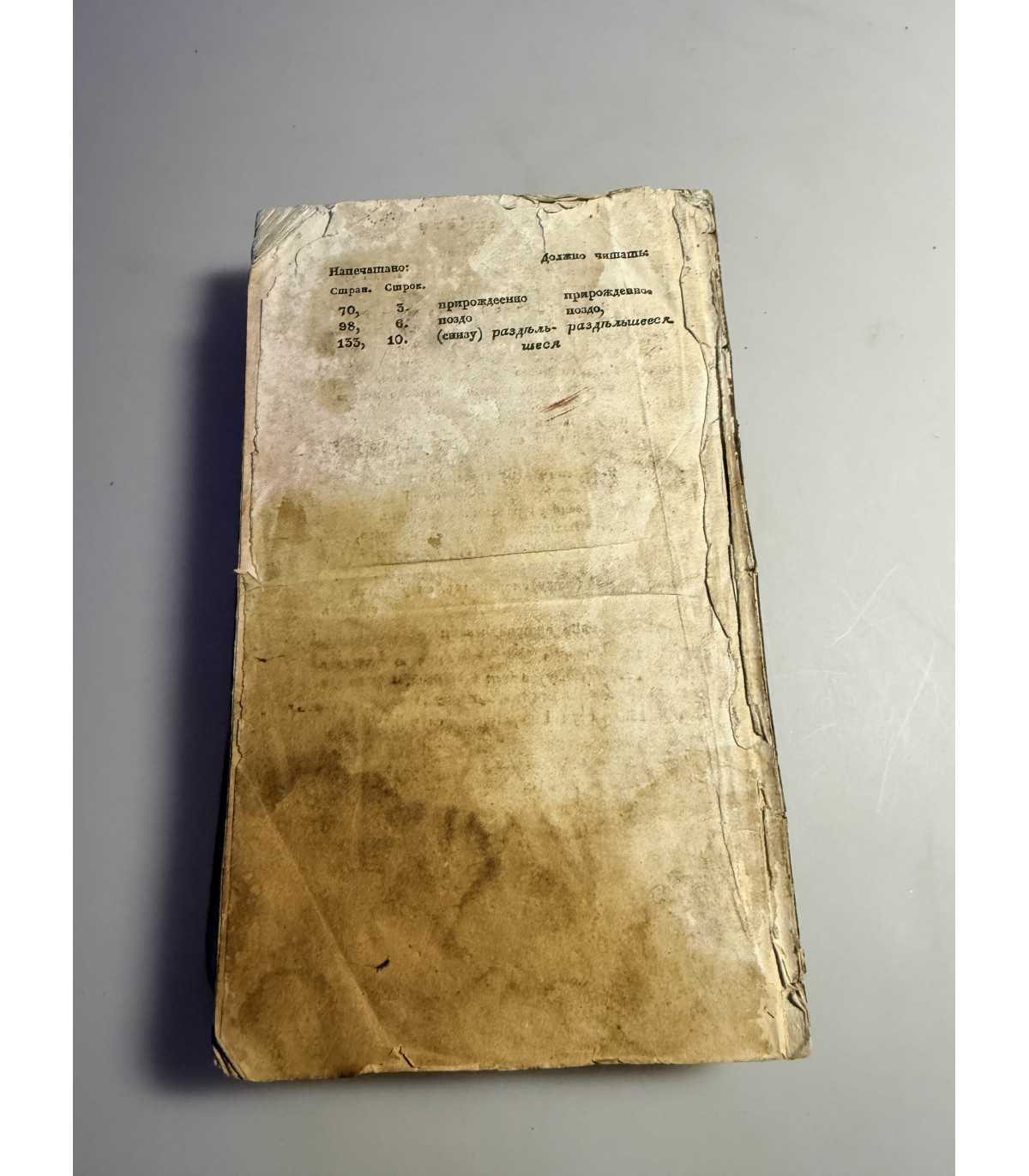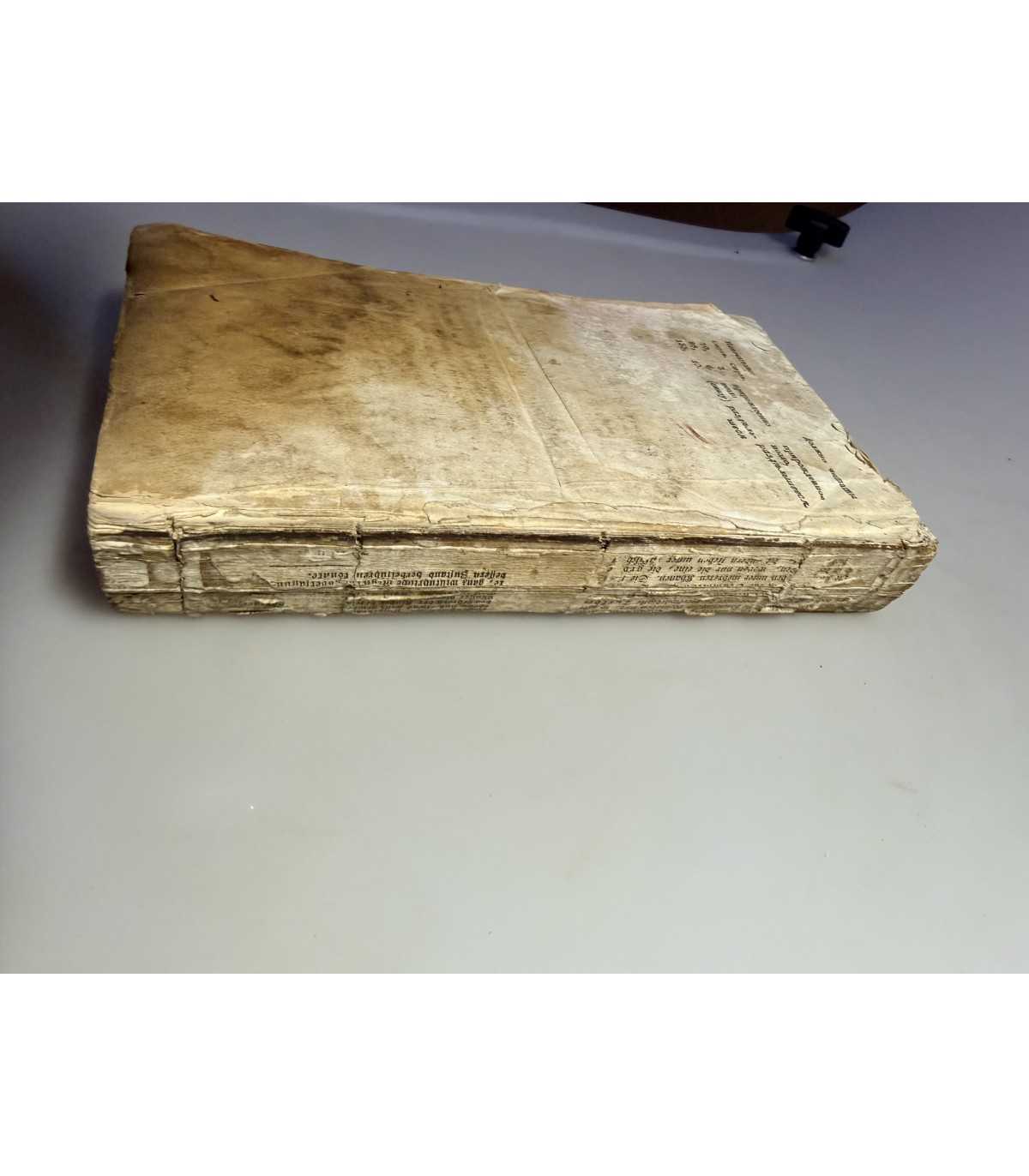 Книжный блок: - плотный, немного деформирован, не распадается, трещинки, выпадающих листов - нет, «лисьи» пятна, загрязнения или пятна от влаги на страницах присутствуют. Титульный лист - сохранен. Первые листы повреждены в низу (утраты текста-не значительны). Состояние: