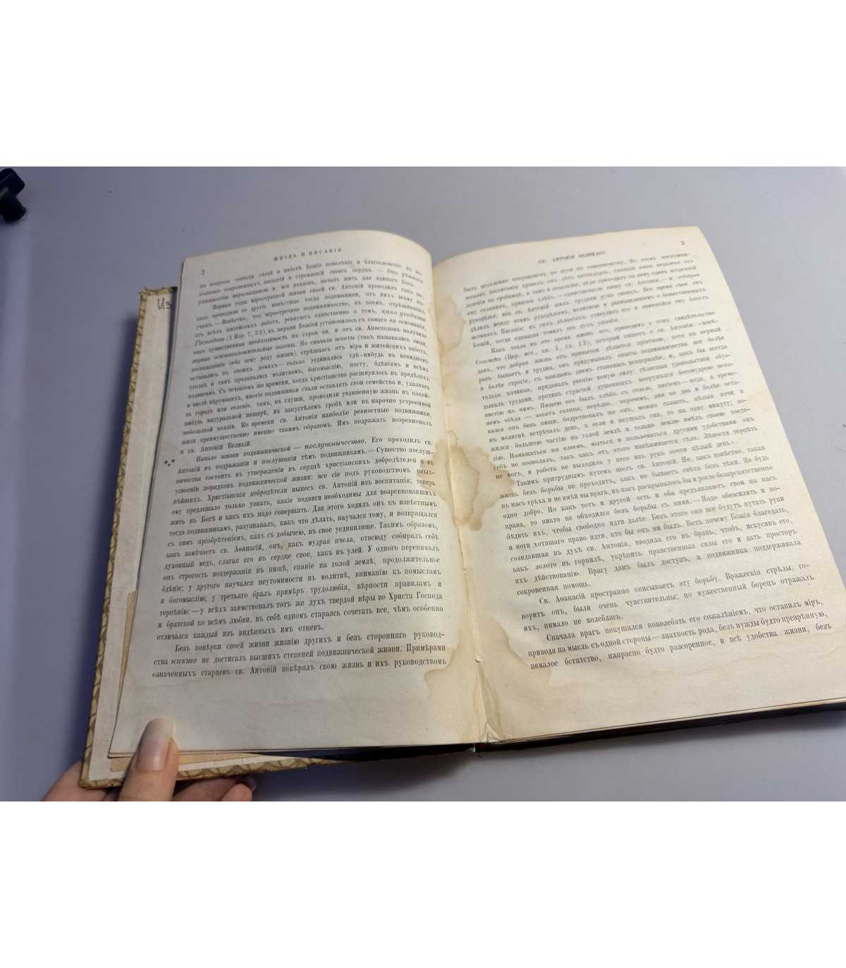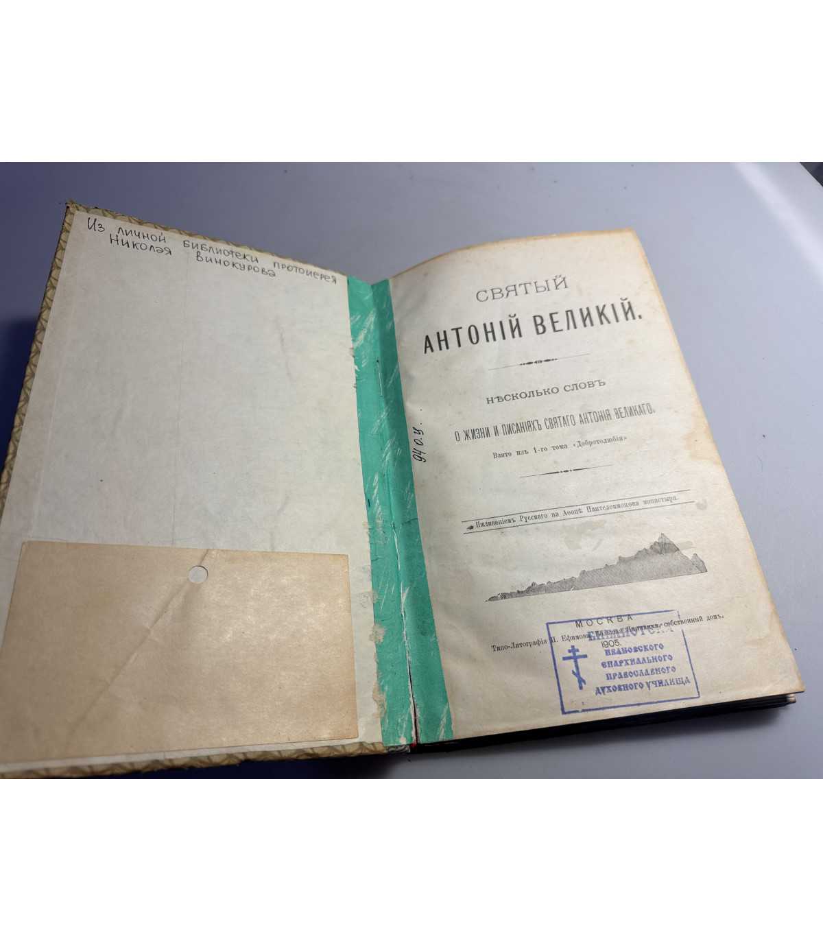 Книжный блок: - плотный, не деформирован, не распадается, трещинки подклеены, выпадающих листов - нет, «лисьи» пятна, загрязнения или пятна от влаги на страницах присутствуют. Титульный лист - сохранен. Есть пометки и владельческая надпись - протоирея Николая Винокурова. Штамп библиотеки духовного училища и кармашек для библиотечной карточки.