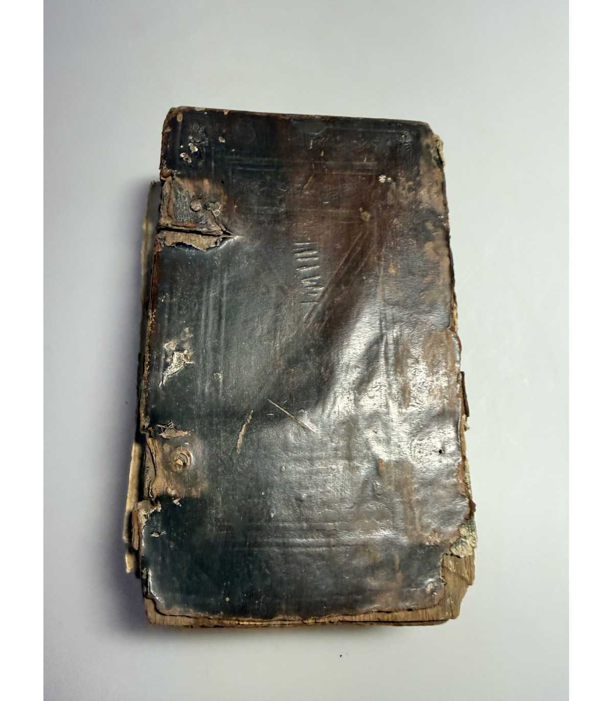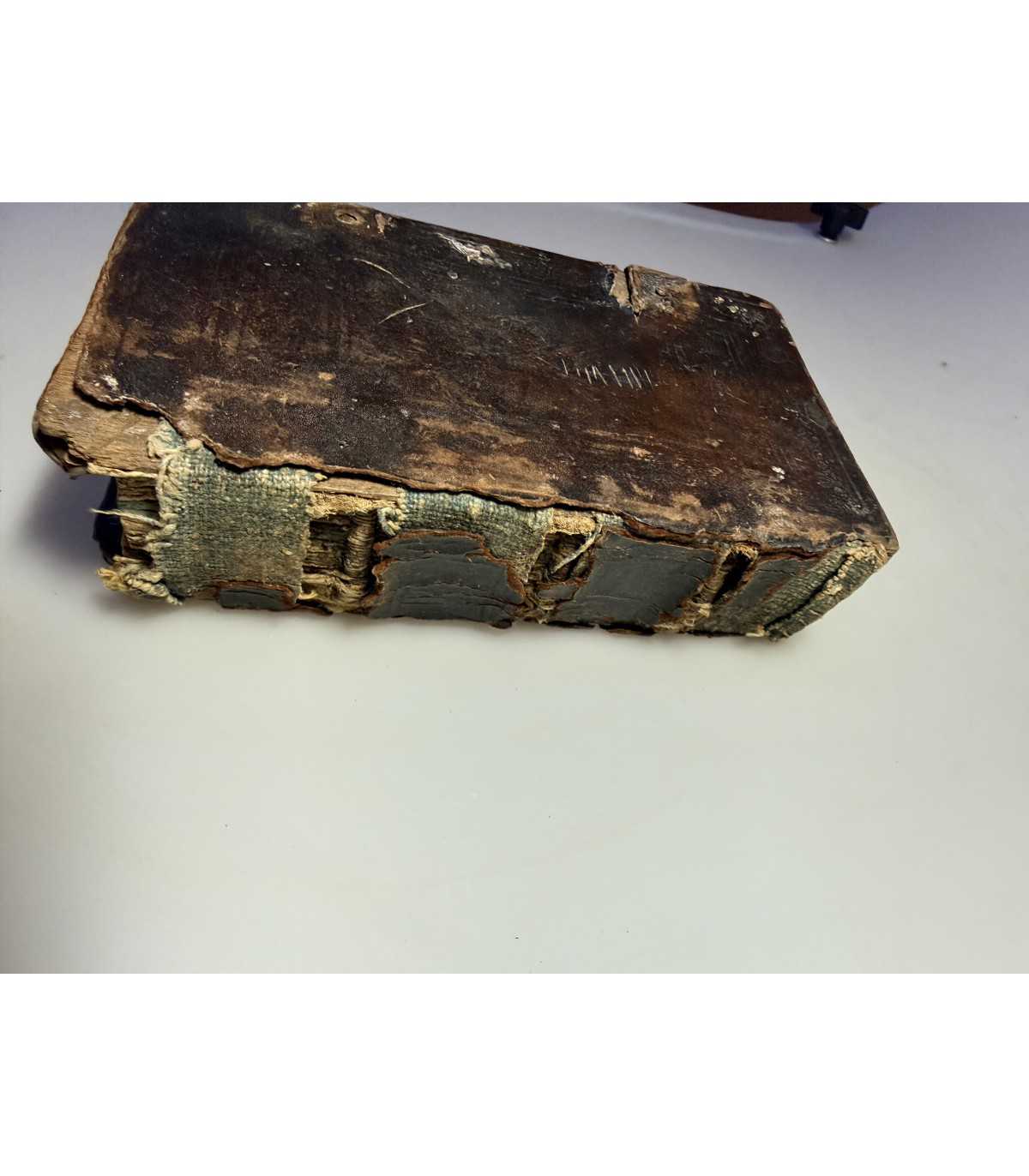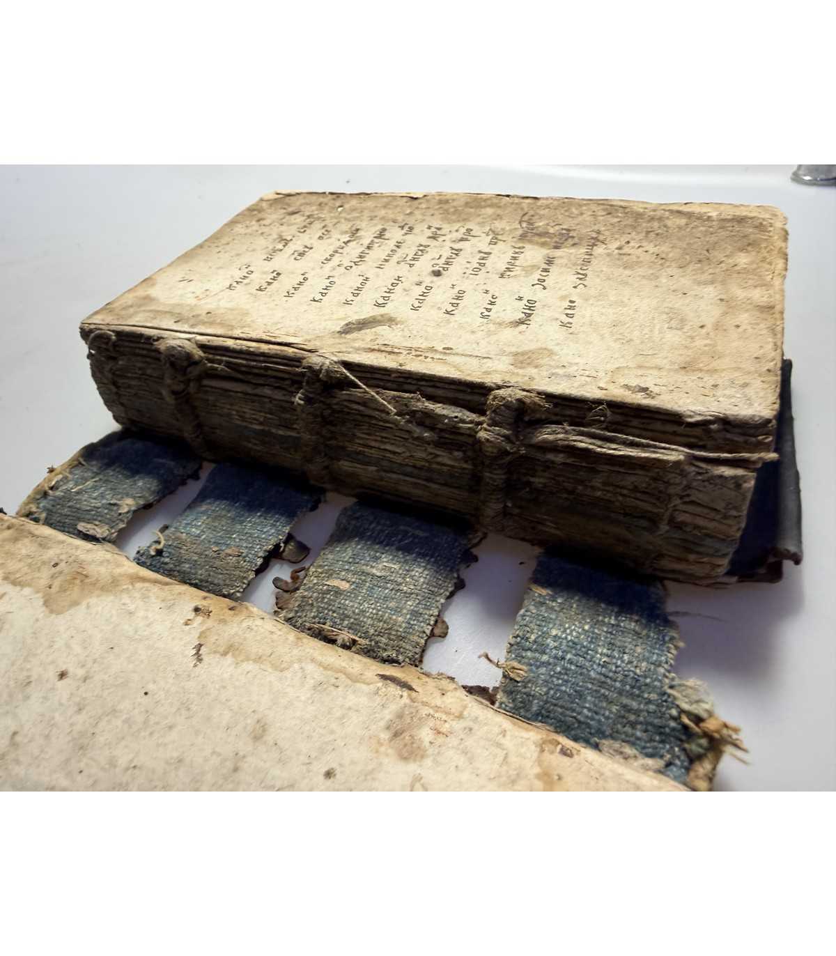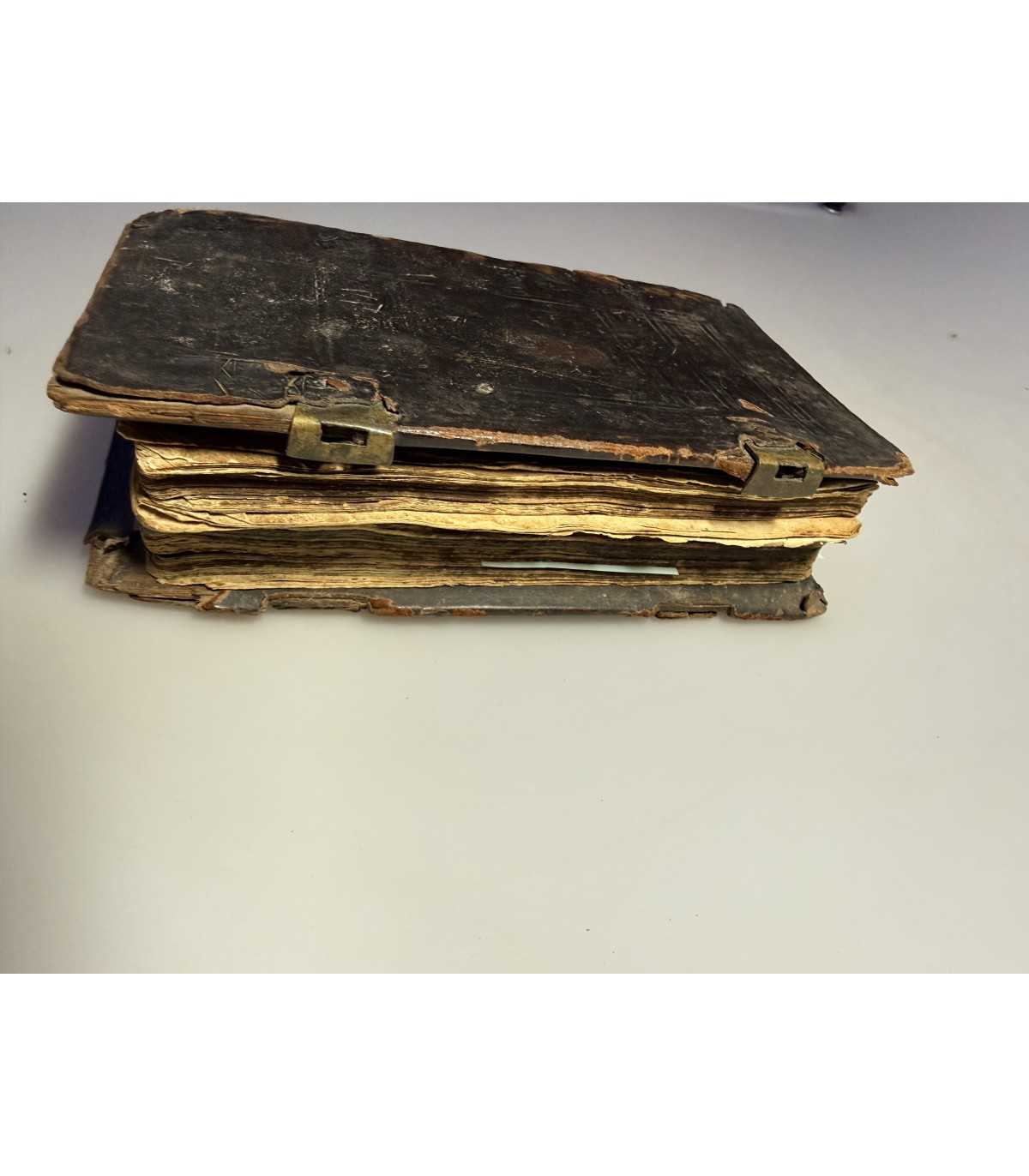 Переплет: эпохи, доска, цельно-кожаный со слепым тиснением, корешок сильно пострадал от времени, небольшие разрывы, и утраты кожи. Два замка, оба утрачены. Состояние: удовлетворительное