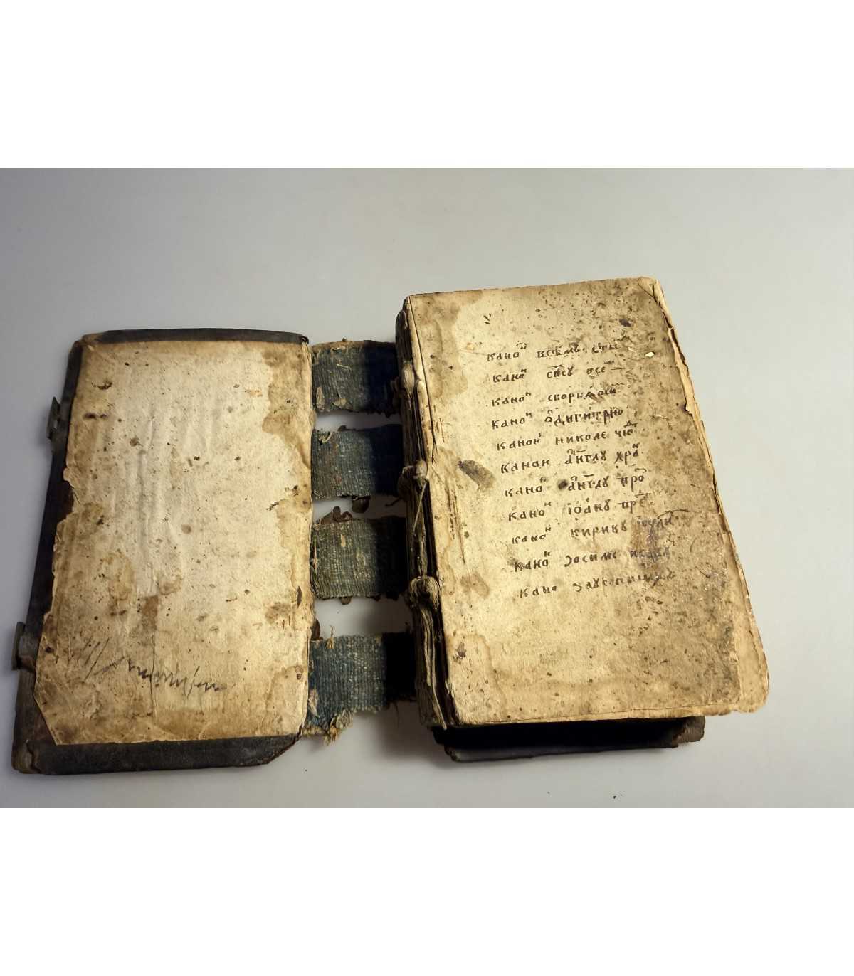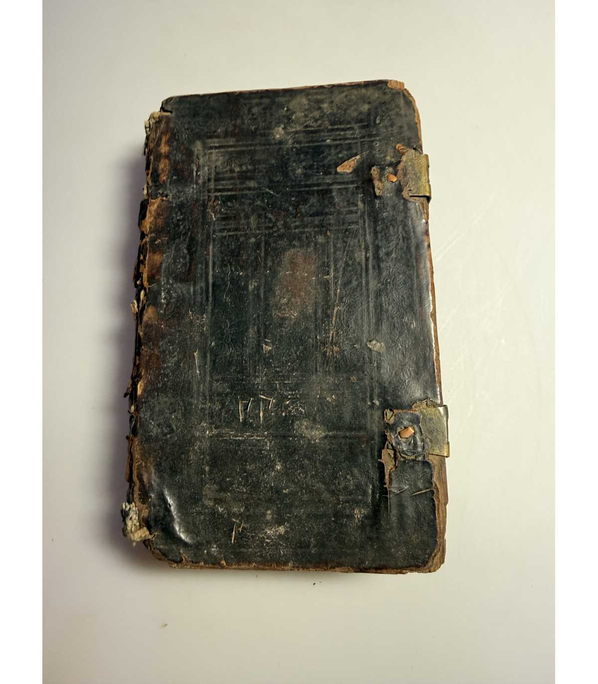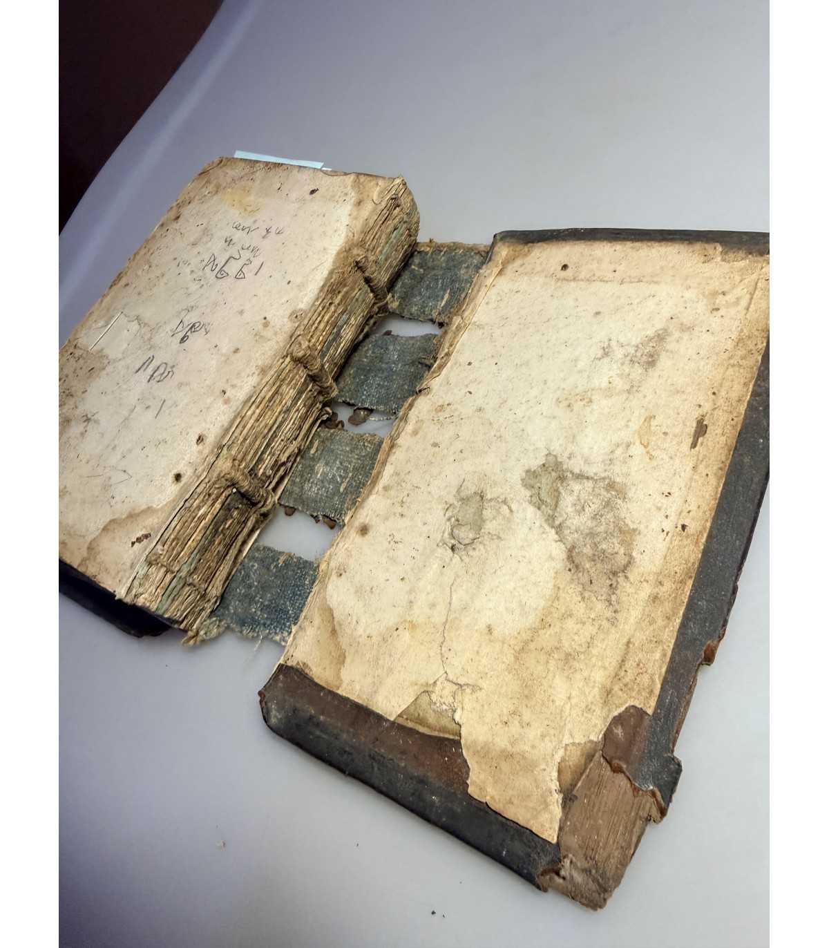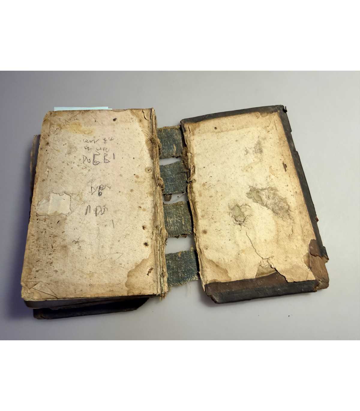 Переплет: эпохи, доска, цельно-кожаный со слепым тиснением, корешок сильно пострадал от времени, небольшие разрывы, и утраты кожи. Два замка, оба утрачены. Состояние: удовлетворительное