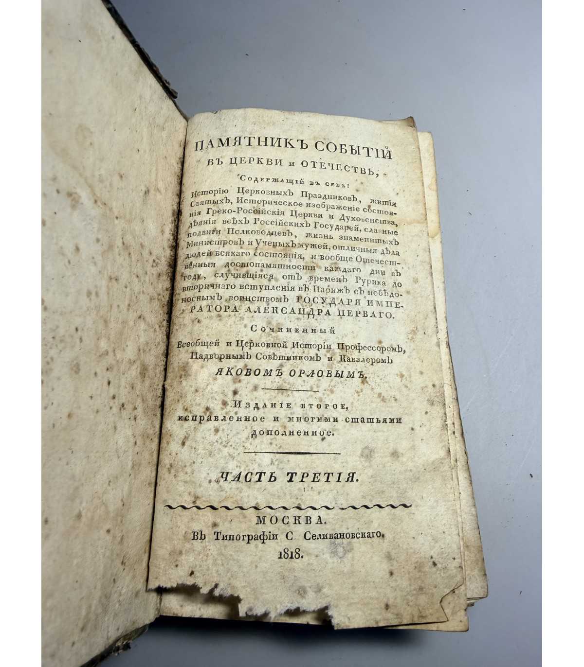памятник событий в церкви и Отечестве, содержащий в себе: историю церковных праздников, жития святых, историческое изооражение состояния греко-российския церкви и духовенства, деяния всех россииских государей, славные подвиги полководцев..., Ч. 3 (1818 г.)