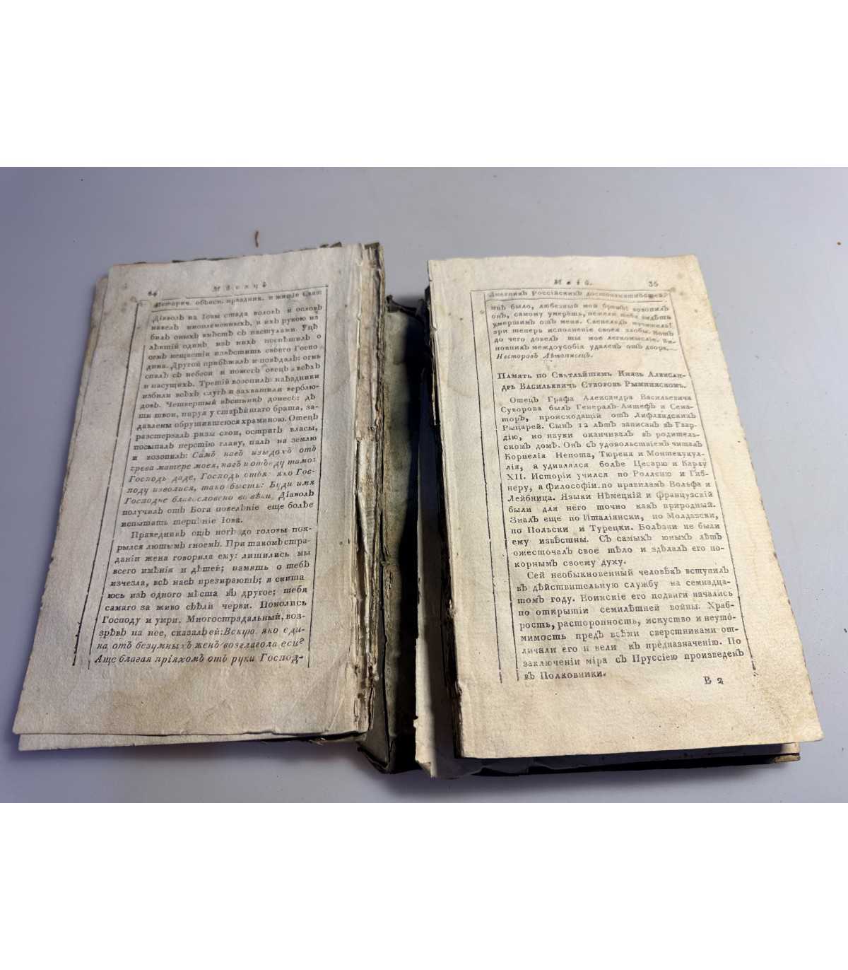 книжный олок: - не плотный, деформирован, распадается. Выпадающие листы - есть, «лисьи» пятна в большом количестве. Титульный лист сохранен.
