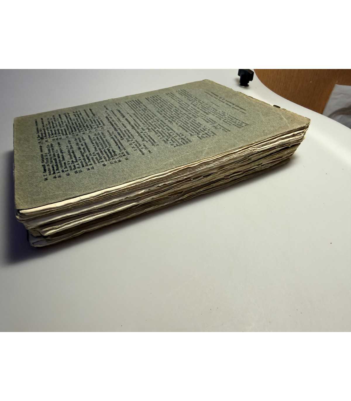 Книжный блок: - не плотный, немного деформирован, не распадается, но некоторые страницы и тетради держатся слабо, есть трещинки у форзацев, но не значительные. Выпадающих листов - нет, листы в большинстве своем чистые. Титульный лист - сохранен, незначительные пометки.