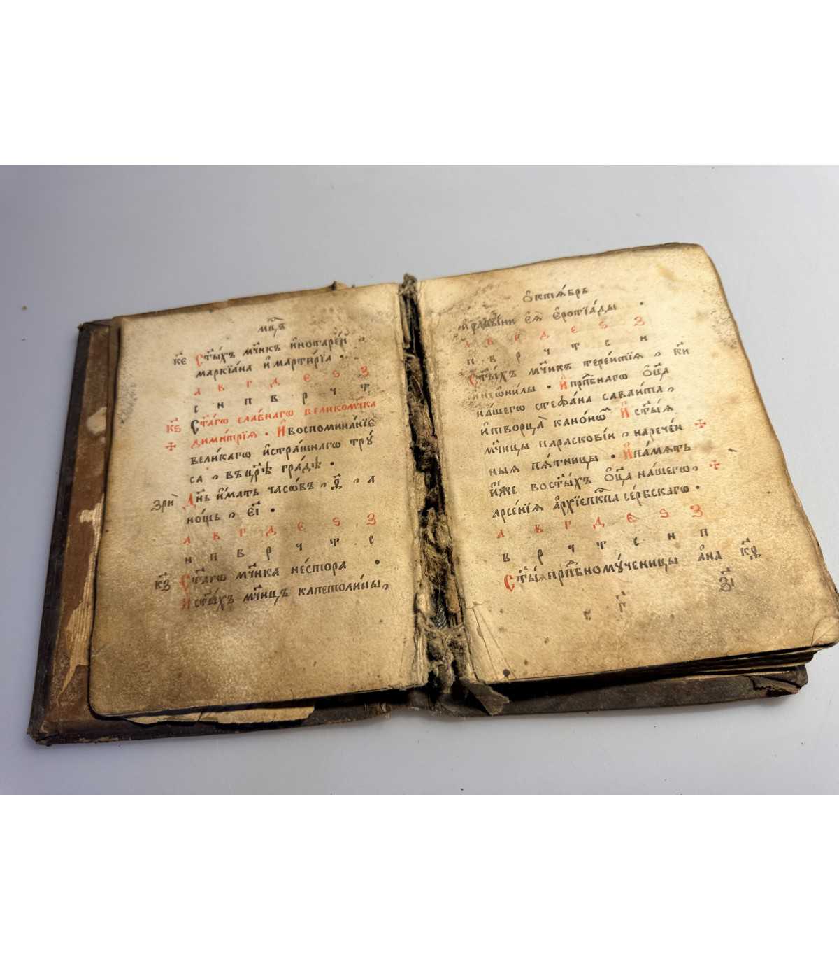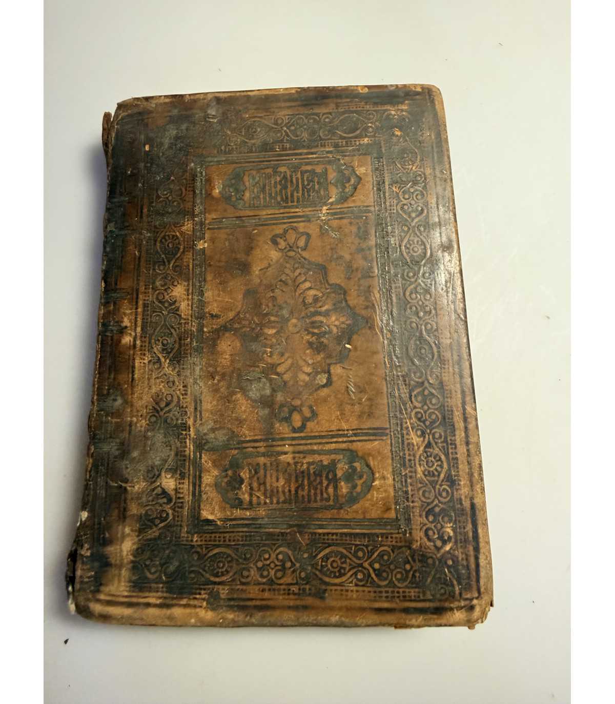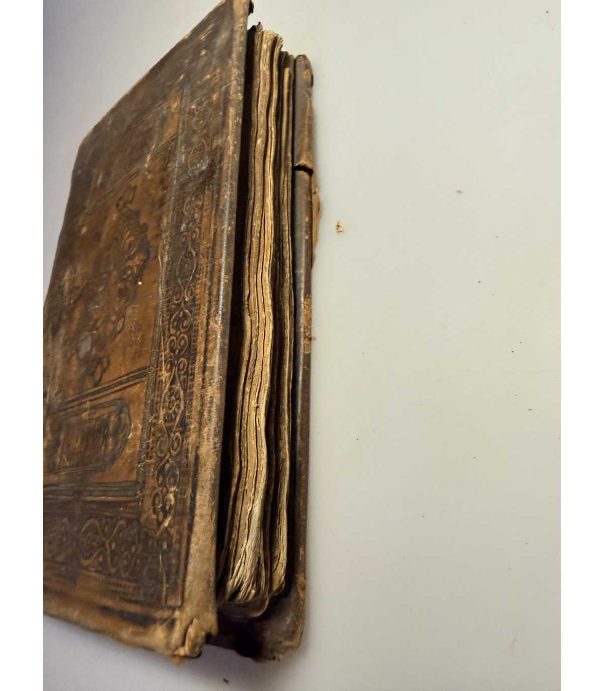 Переплет: эпохи, доска, цельно-кожаный со слепым тиснением, небольшие разрывы, потертости и утраты кожи. С К.Б. соединен слабо. Состояние: удовлетворительное