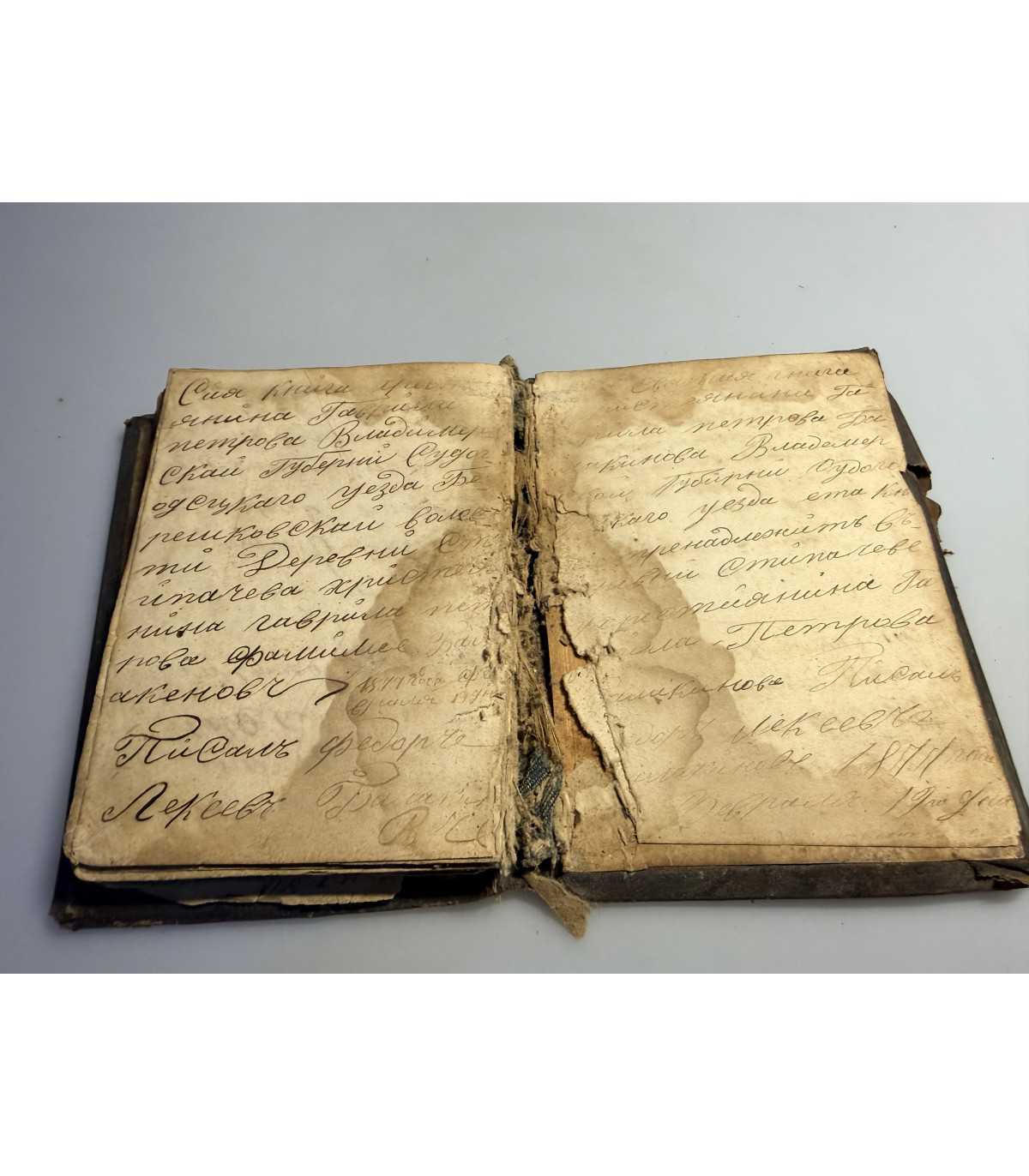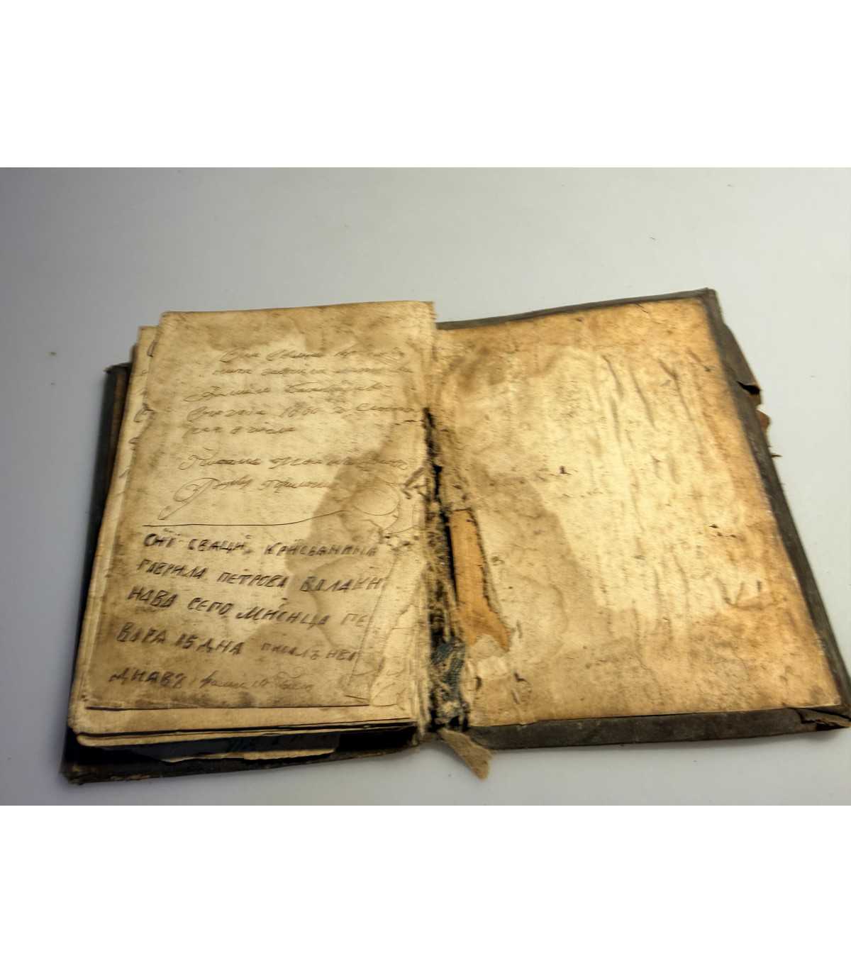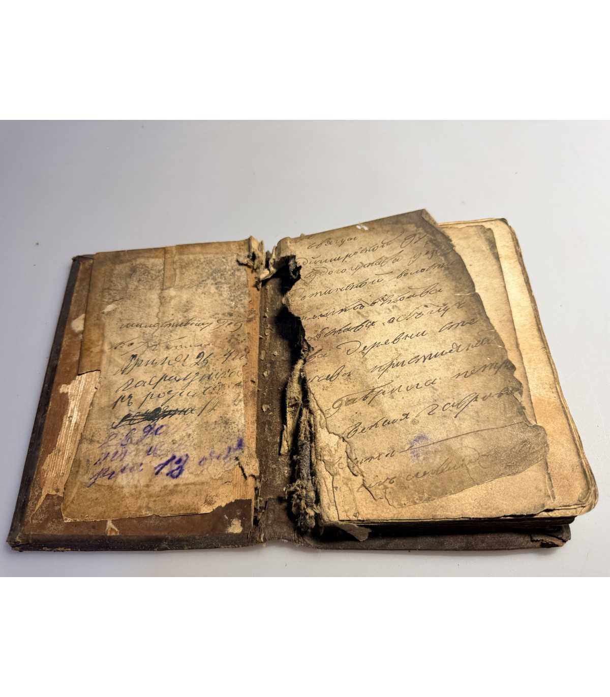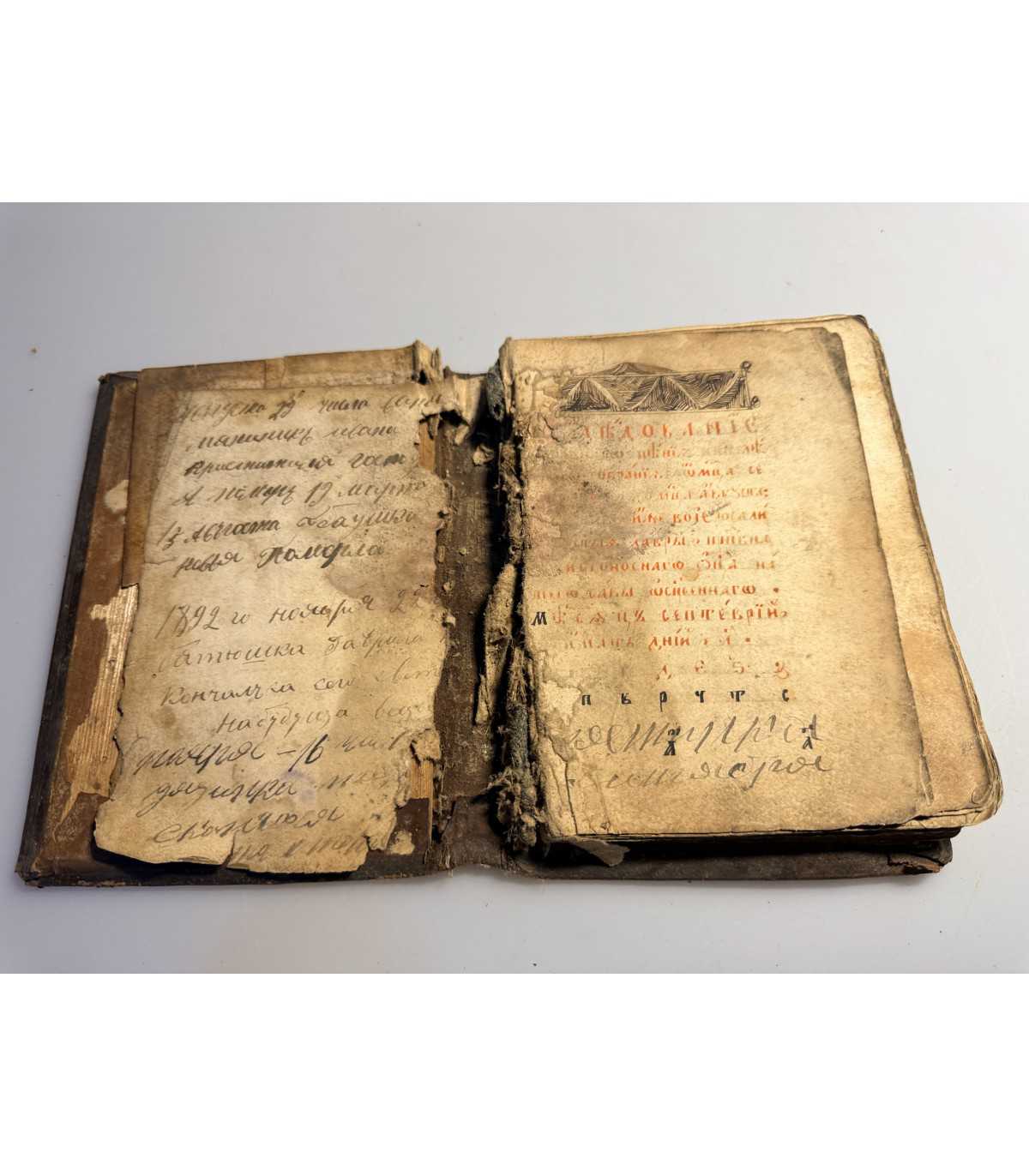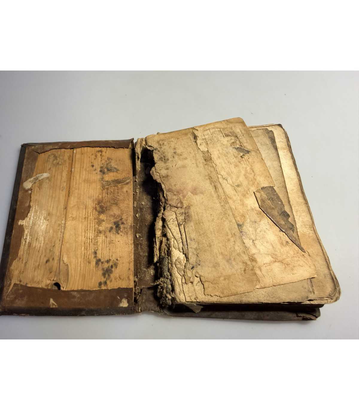 - отсутствует. В сшиве трещинки. Есть листы надорванные и слабодержащиеся. Первый лист потрепан. Листы форзацев оторвани и исписаны владельцами. Есть пометки и владельческие надписи.