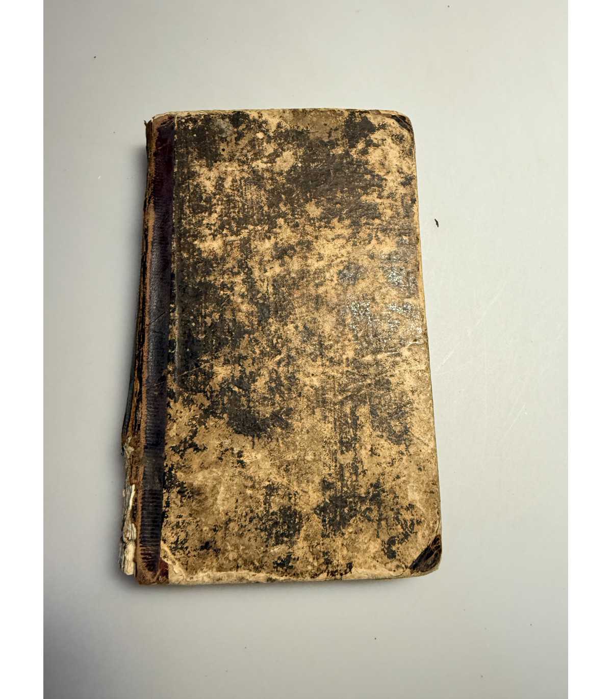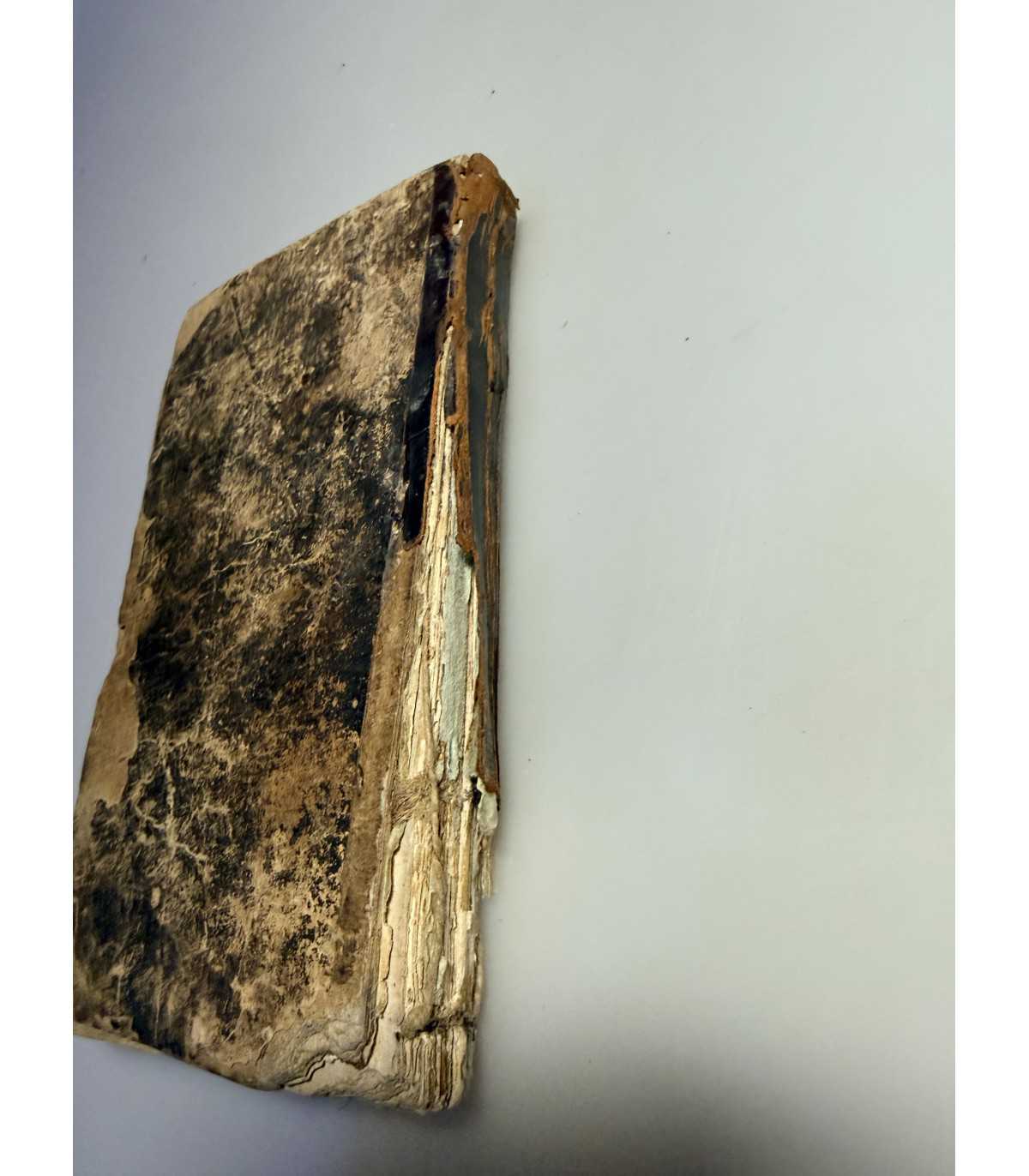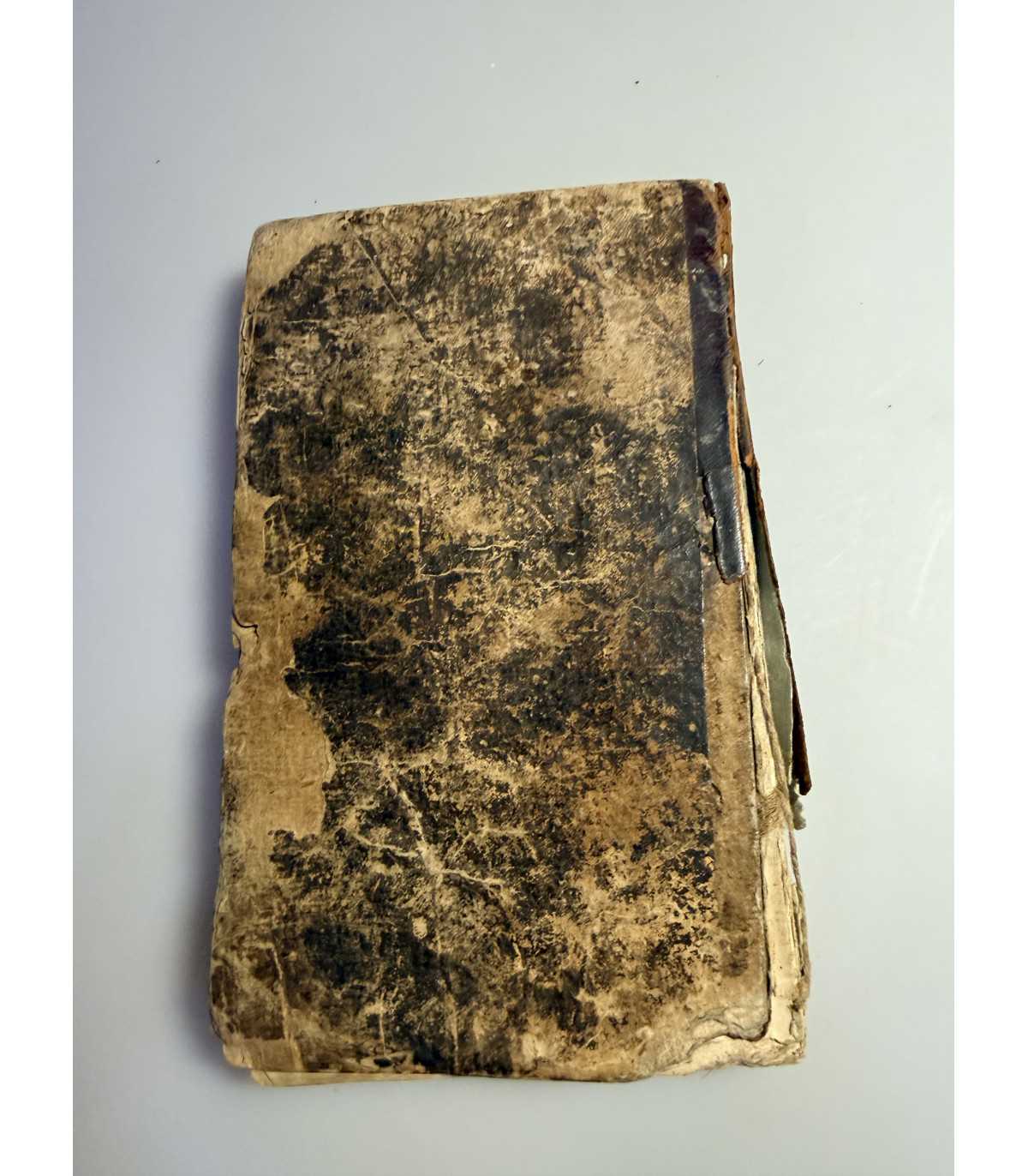 Переплет: смешанный картонно-кожаный, утрата части кожи на корешке, трещинки и разрывы; потертости и расслоение картона на крышках, состояние удовлетворительное.