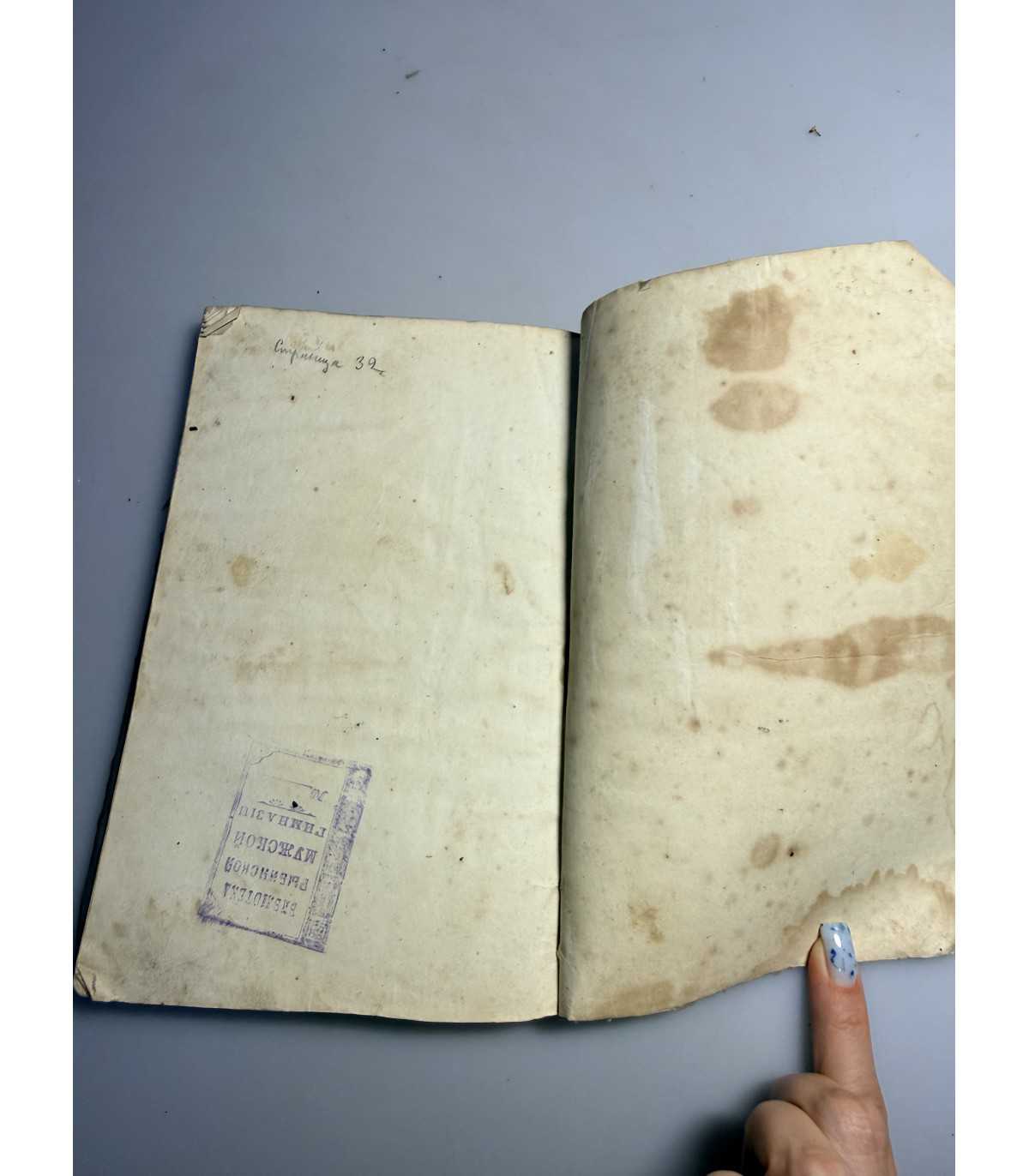 Книжный блок: - плотный, не деформирован, не распадается, выпадающих листов - нет, «лисьи» пятна, загрязнения или пятна от влаги на страницах присутствуют. Титульный лист - сохранен. Есть пометки, печати библиотеки Рыбинской мужской гимназии, незначительный разрыв на переднем форзаце.