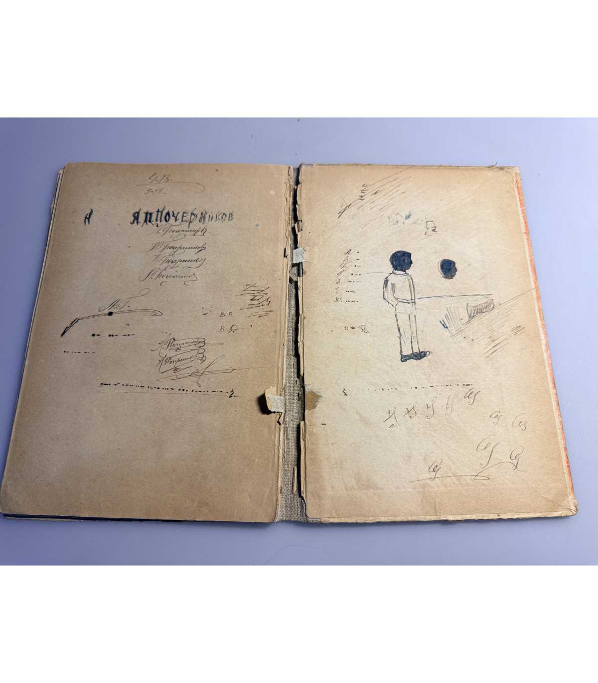 Книжный блок: - плотный, не деформирован, не распадается, но есть трещины, выпадающих листов - нет, «лисьи» пятна, загрязнения или пятна от влаги на страницах присутствуют. Титульный лист - сохранен. Есть пометки, рисунки и надписи на форзацах.