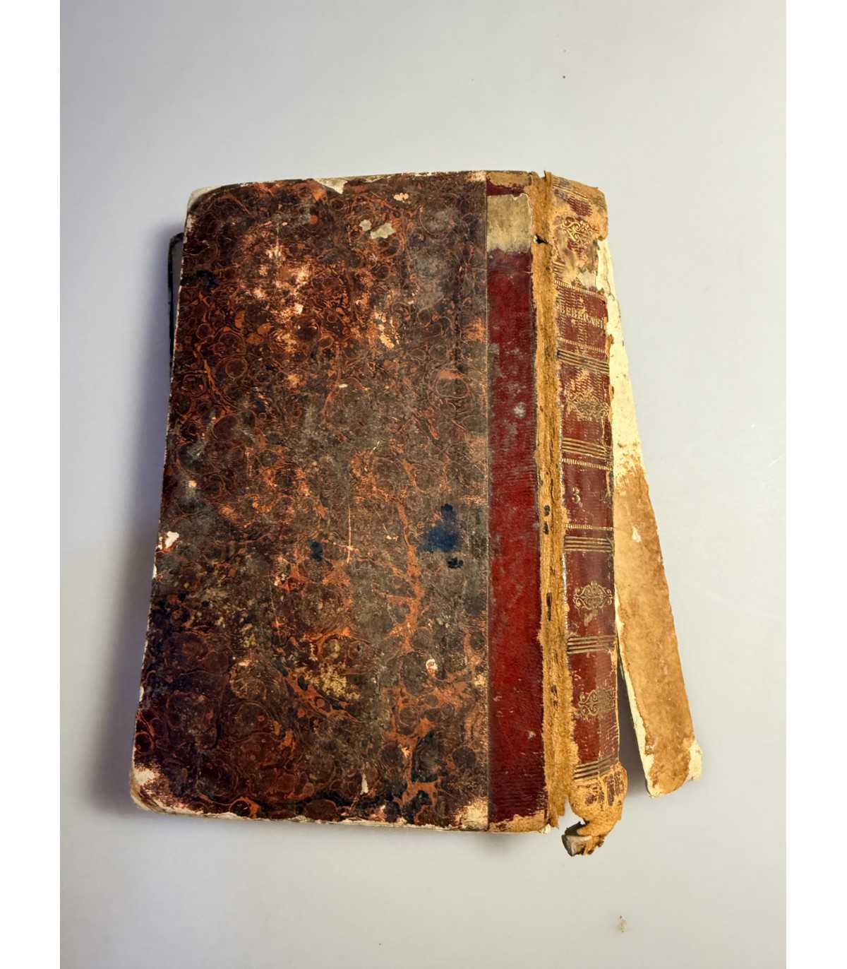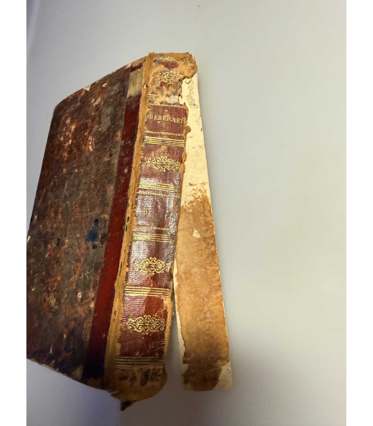 Переплет: смешанный картонно-кожаный; великолепное тиснение на корешке, корешок скреплен с нижней крышкой, верхняя - отдельно, переплет не скреплен с КБ, разрывы и потертости на коже корешка, на крышках расслоение картона по уголкам и потертости по краям. Переплет в удовлетворительном состоянии.