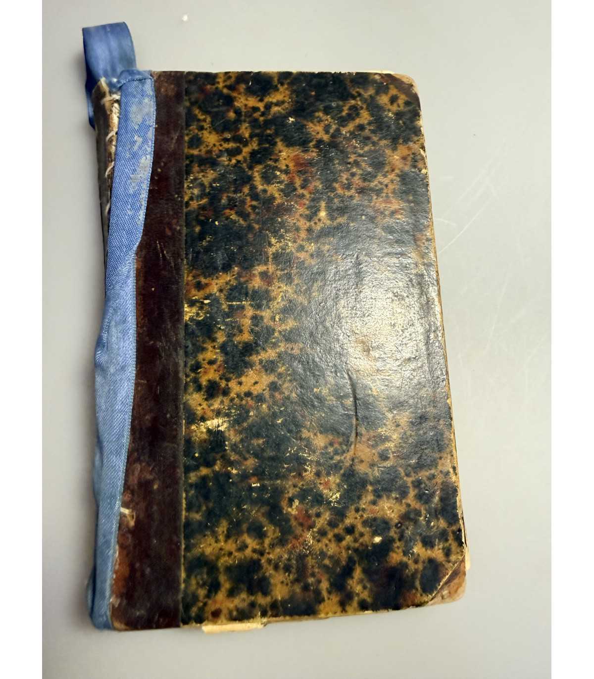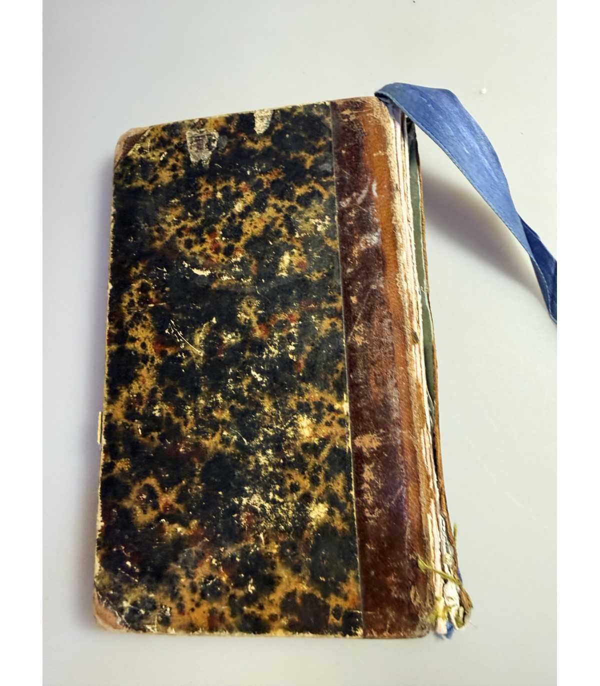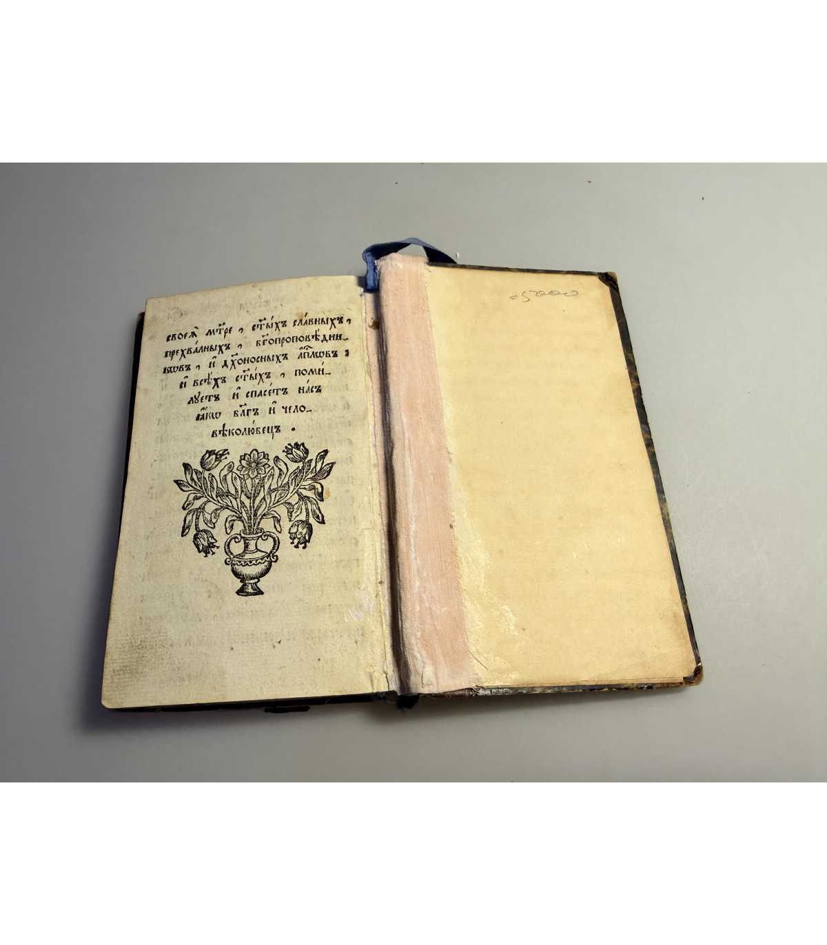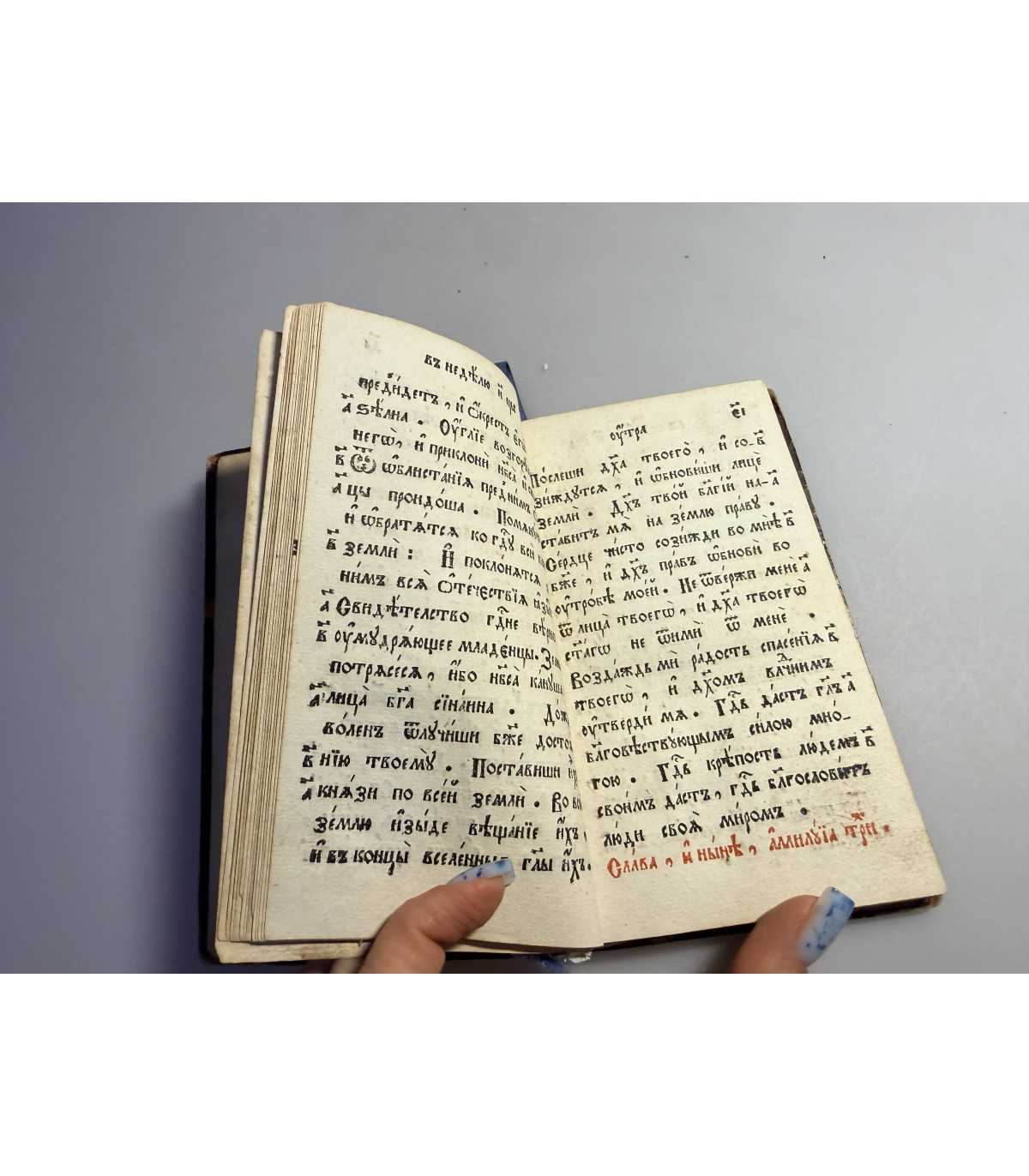 переплет: смешанный, картонно-кожаный. На переплете видны потертости, трещины, разрывы, утраты кусочков. Бумажные форзацы. Корешок подшит нитками, домашняя реставрация кусочками тесьмы, на корешке тиснение золотом «Пятдесятница». Состояние: хорошее