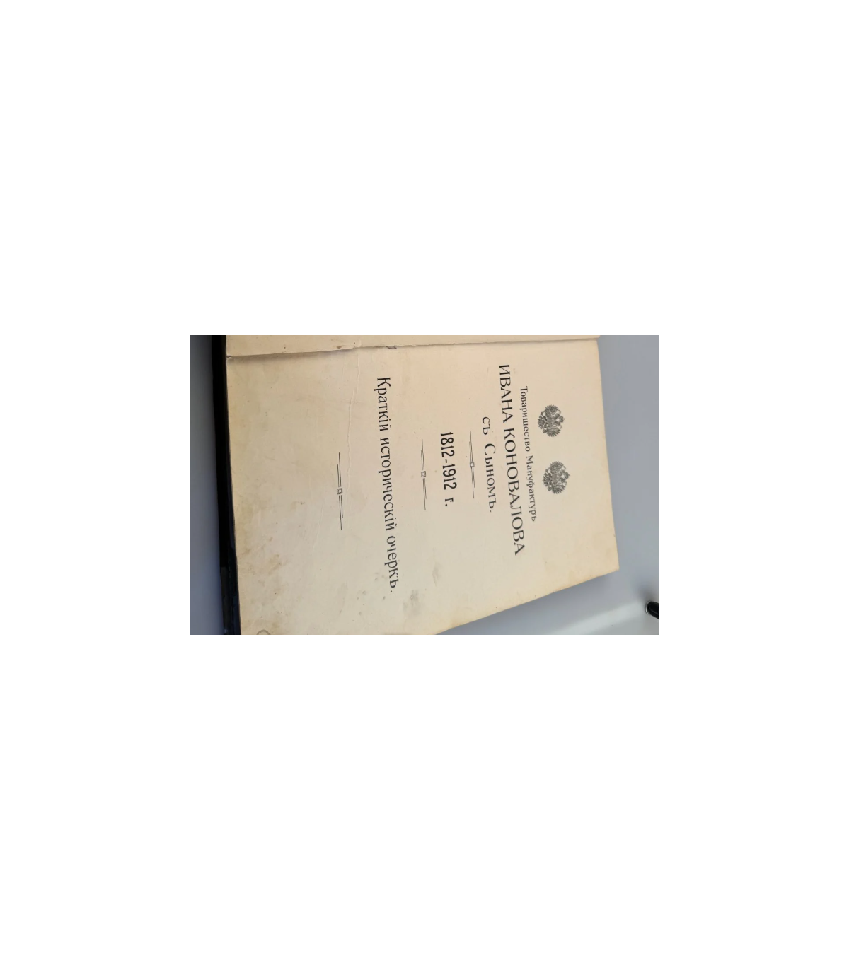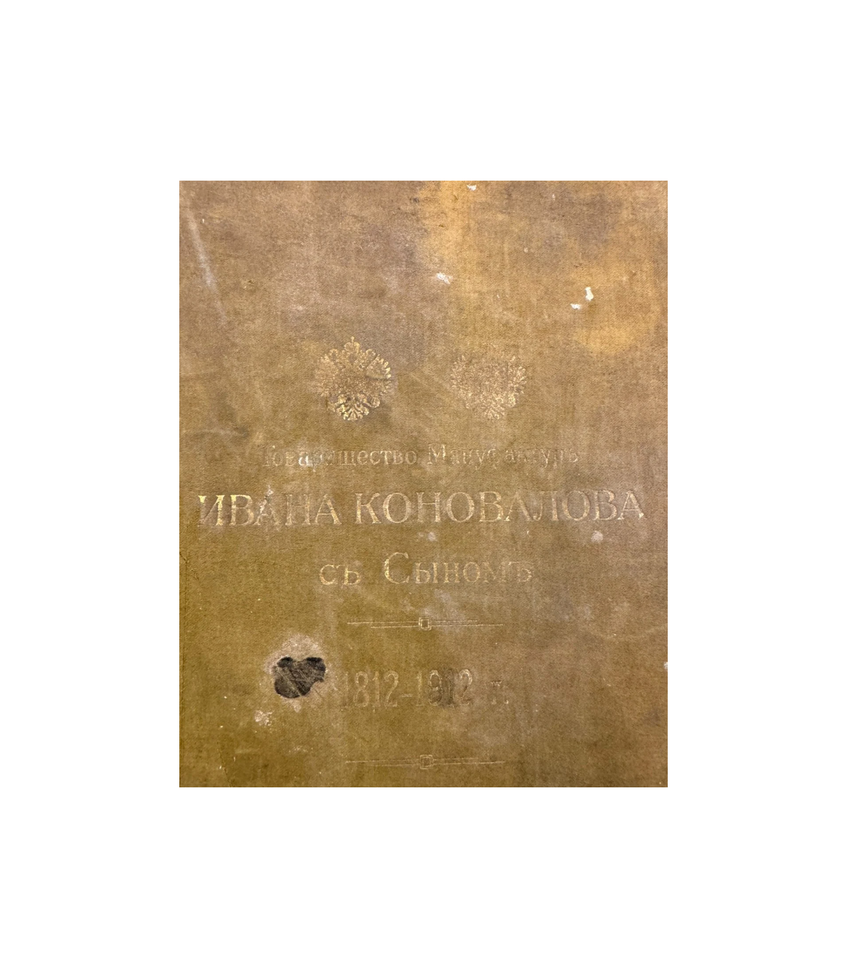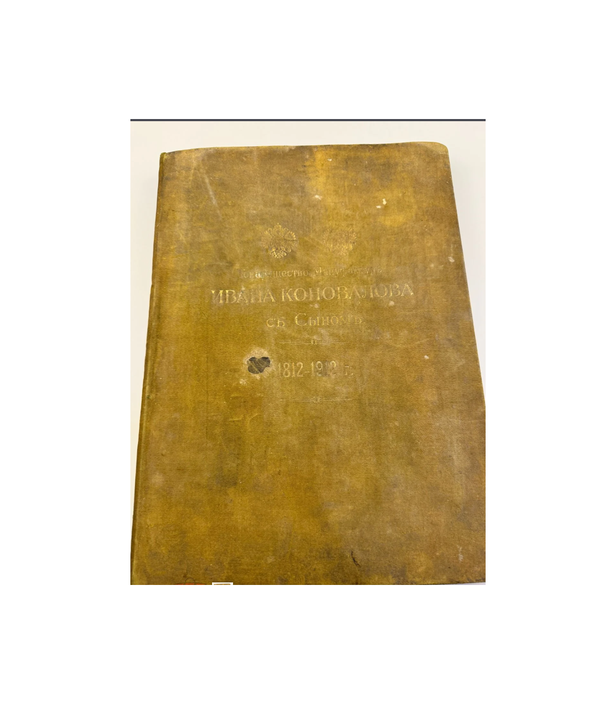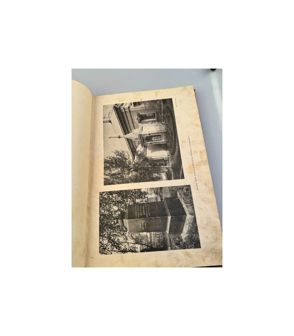 Переплет: издание-альбом увеличенного формата, в современном тканевом переплете светло-зеленого цвета - имеются потертости, загрязнения, повреждения. На верхней крышке помещены название издания и два герба Российской империи, выполненные в золотом тиснении. На корешке - также название издания золотым тиснением. Форзацы оклеены бумагой растительной тематики с золотым отливом.