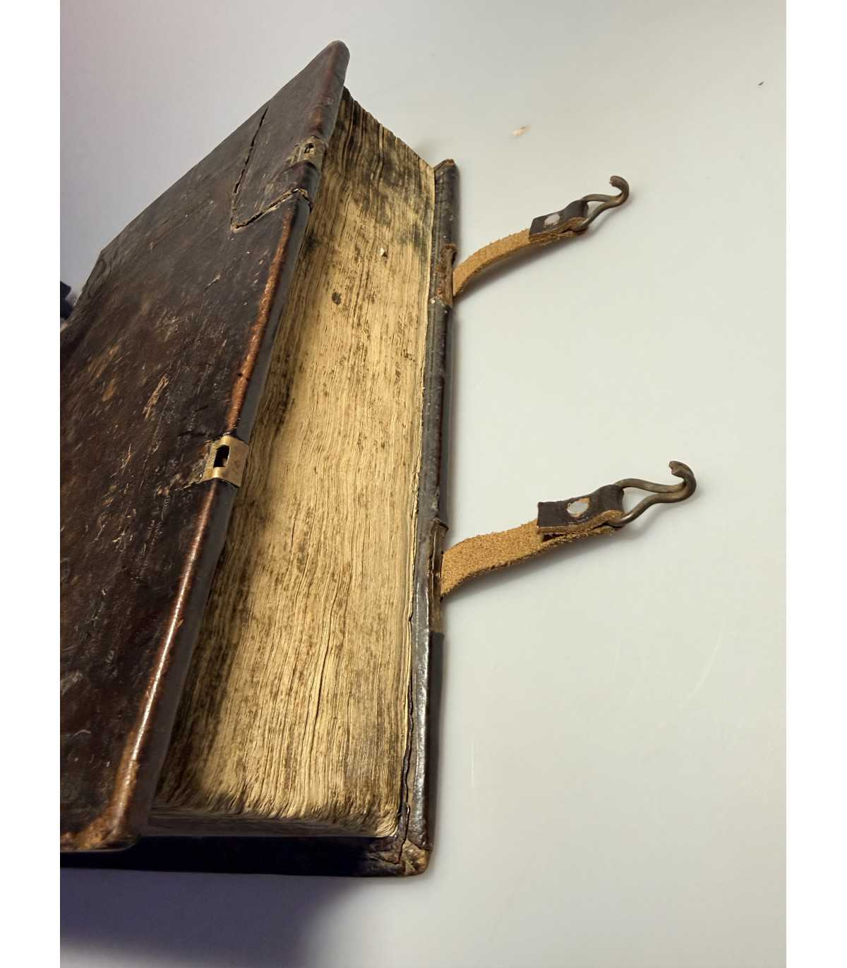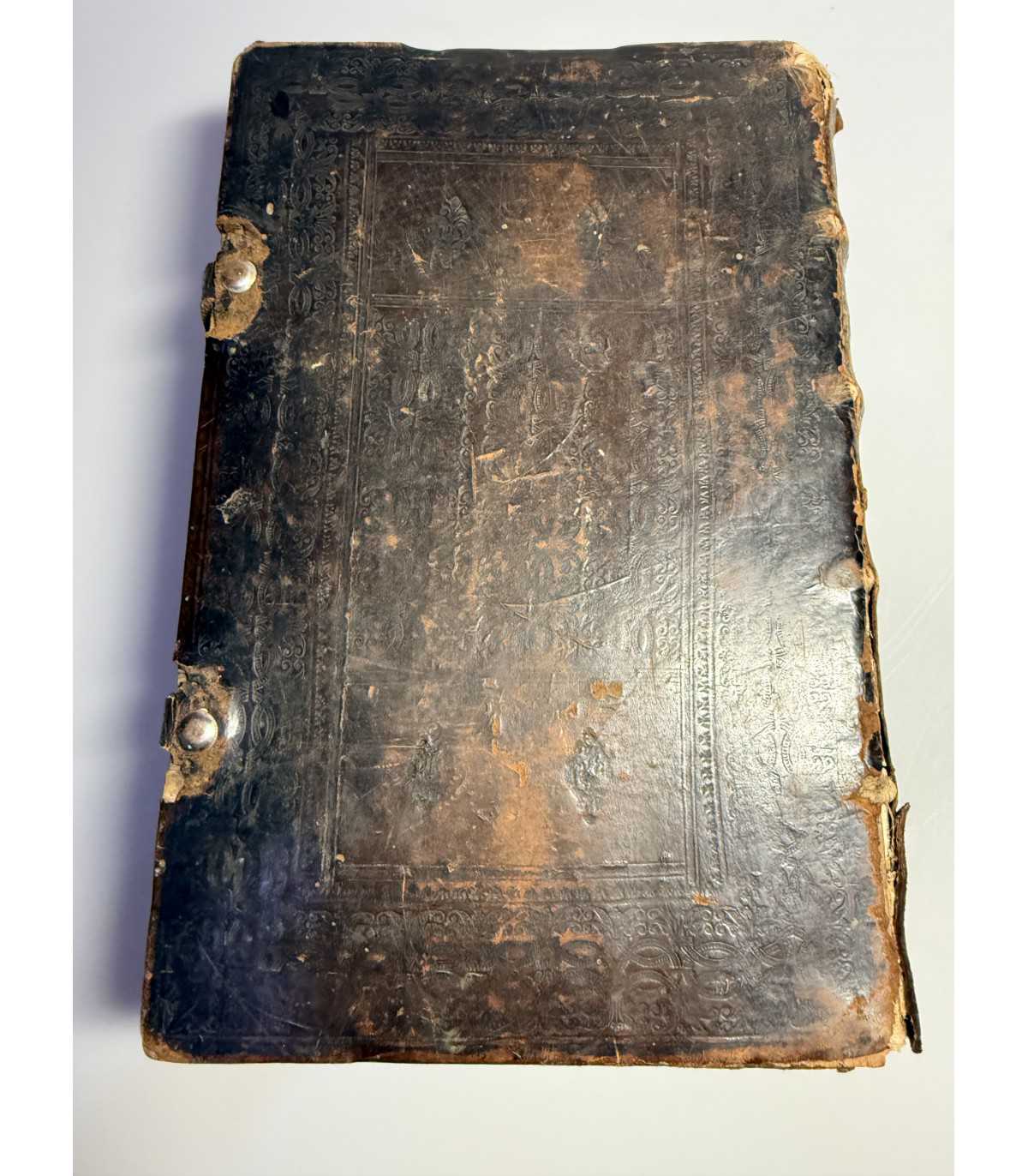 Переплет: цельно-кожаный, слепое тиснение на обеих крышках. На переплете видны потертости, трещинки, разрывы, утраты мелких кусочков кожи на корешке. Два замка, возможно более позднего времени. Бумажные форзацы. Состояние: хорошее