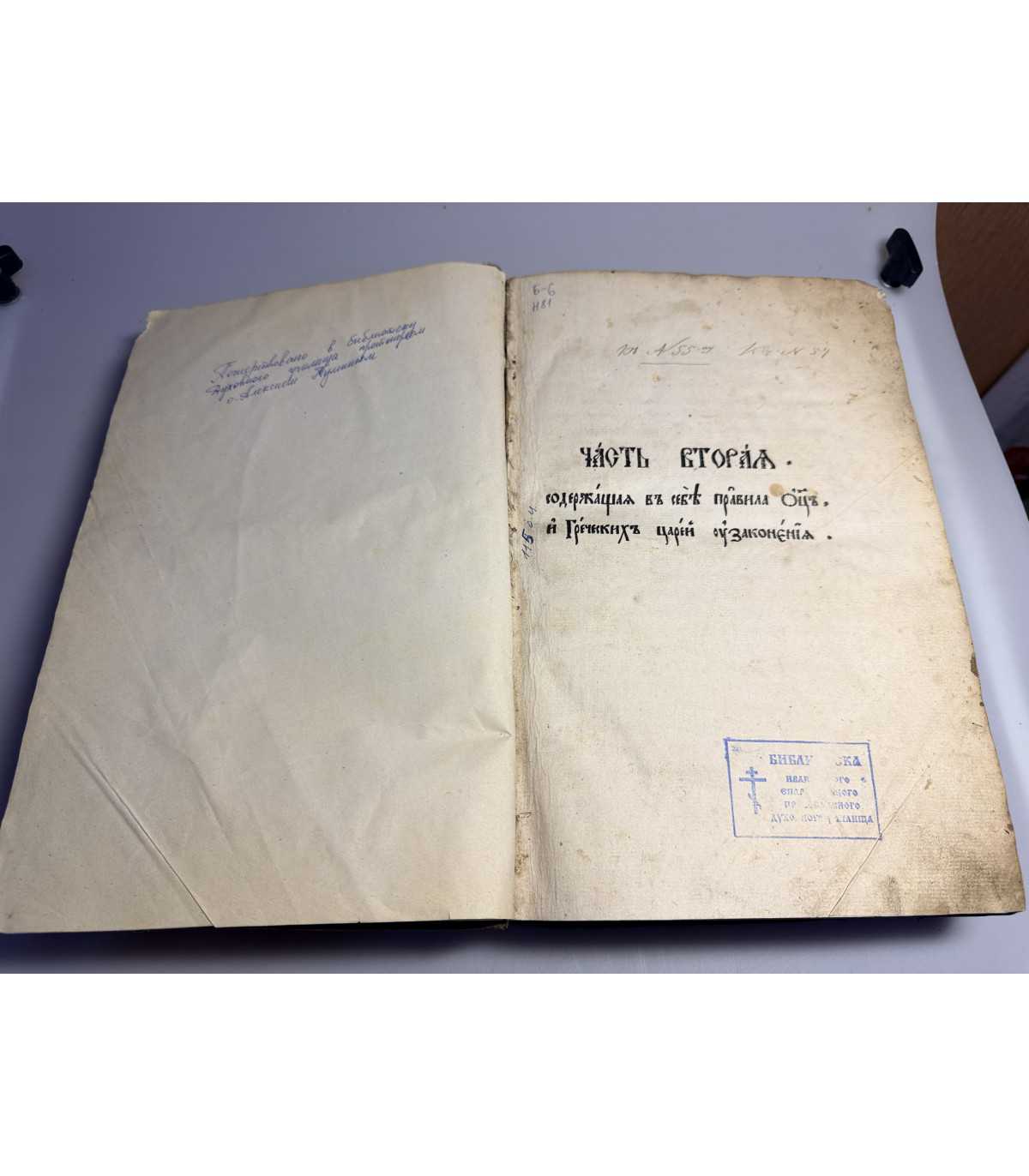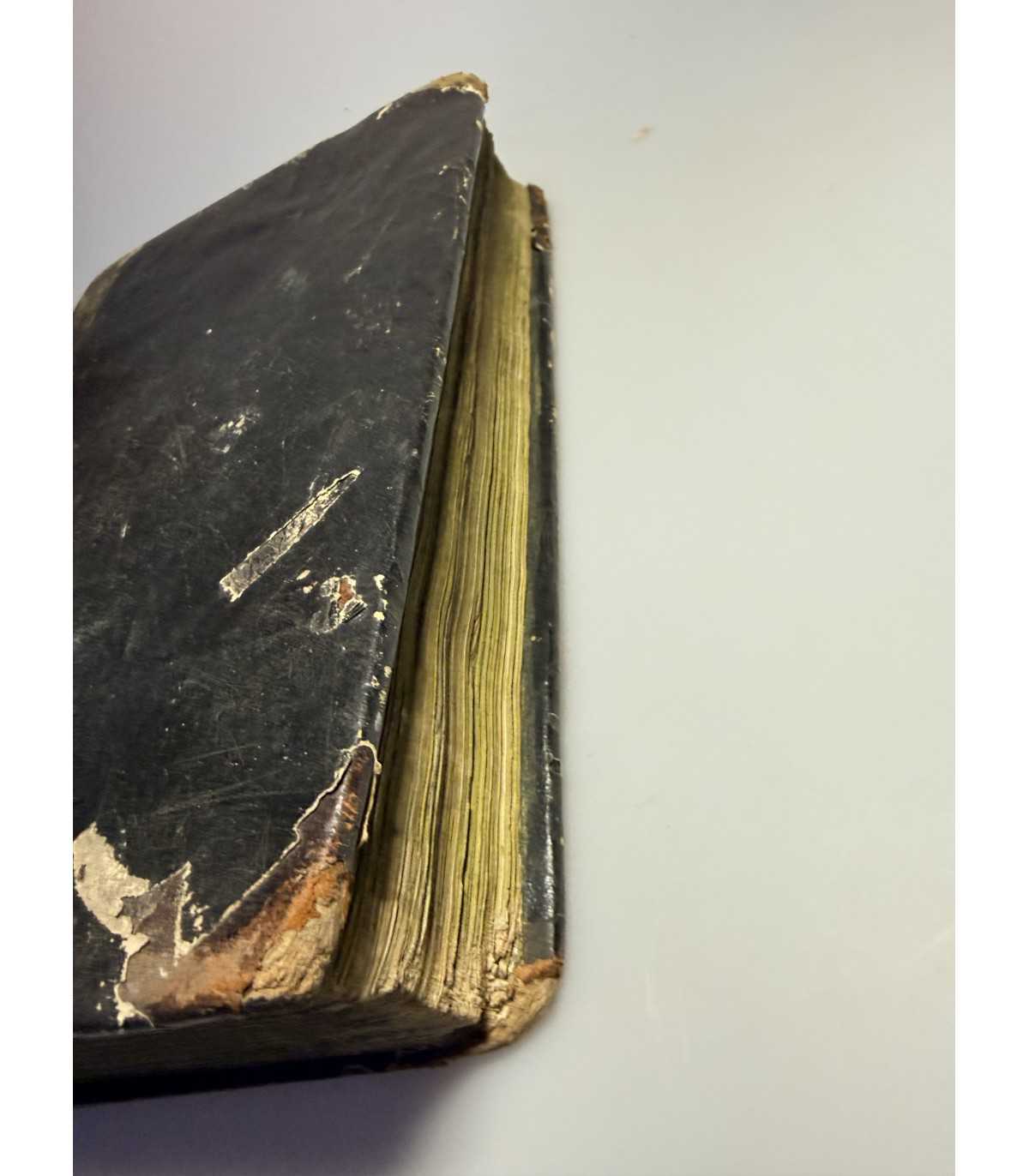 Книжный блок: - плотный, не деформирован, не распадается, выпадающих листов - нет, «временные» пятна или пятна от влаги на страницах присутствуют, но редко. Титульный лист - в первой книге, на переднем форзаце библиотечные номера и дарственная надпись, на первом листе штамп библиотеки, как и на листе 6. Кое-где встречаются пометки, сделанные карандашом, ручкой или пером. Некоторые листы аккуратно реставрированы с восстановлением текста рукописно. Отсутствуют листы 322 и 323, возможно ошибка пагинации. Есть ошибки пагинации, подписанные печатниками. Верхний уголок части листов в начале книги немного поврежден, возможно мышкой. Обрез цветной, зеленый.